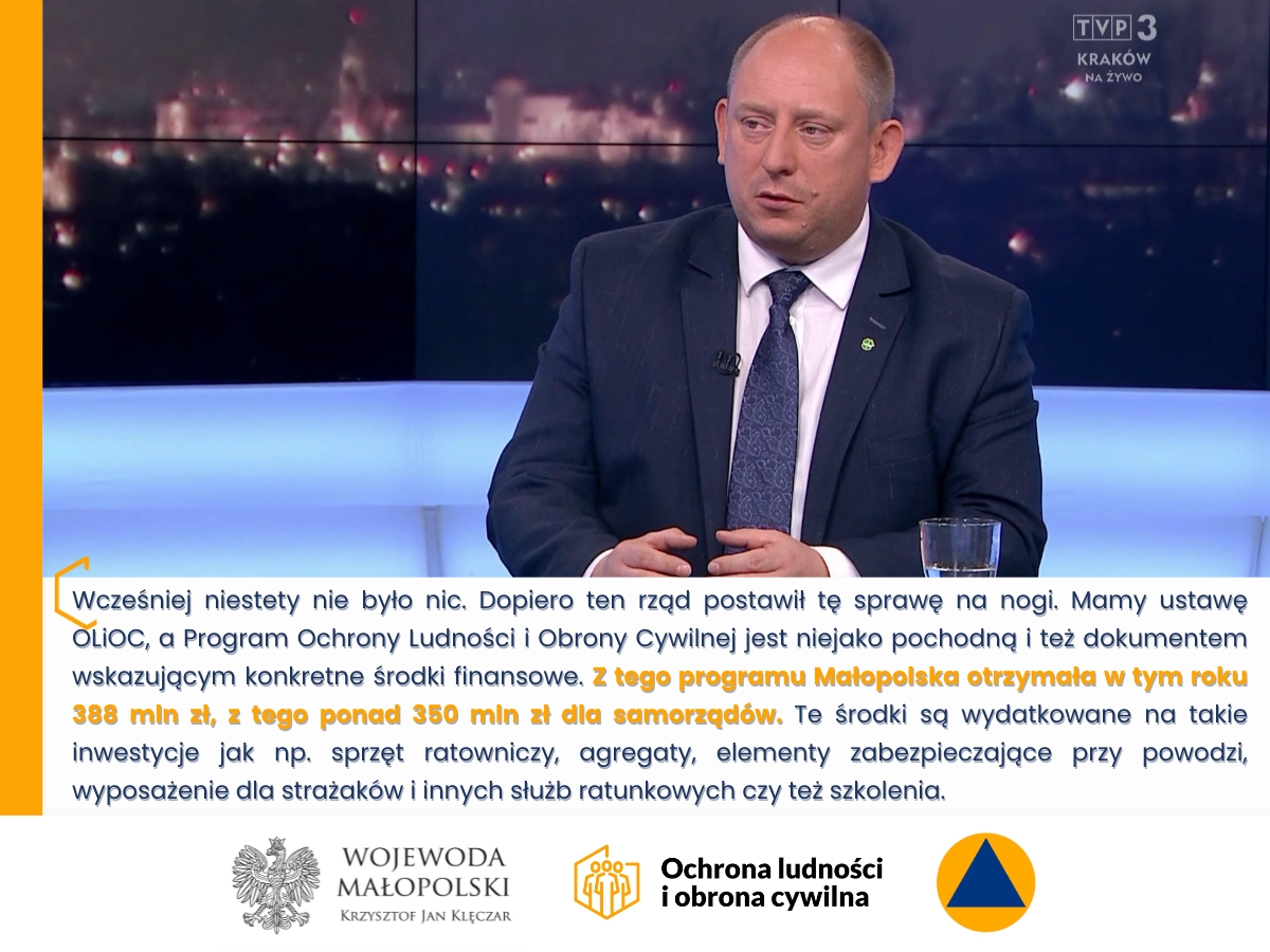 - Wcześniej niestety nie było nic. Kolejne akty prawne nie były ze sobą kompatybilne. Dopiero ten rząd postawił tę sprawę na nogi. Mamy ustawę OLiOC, a Program Ochrony Ludności i Obrony Cywilnej jest niejako pochodną i też dokumentem wskazującym konkretne środki finansowe – mówi wojewoda małopolski Krzysztof Jan Klęczar.