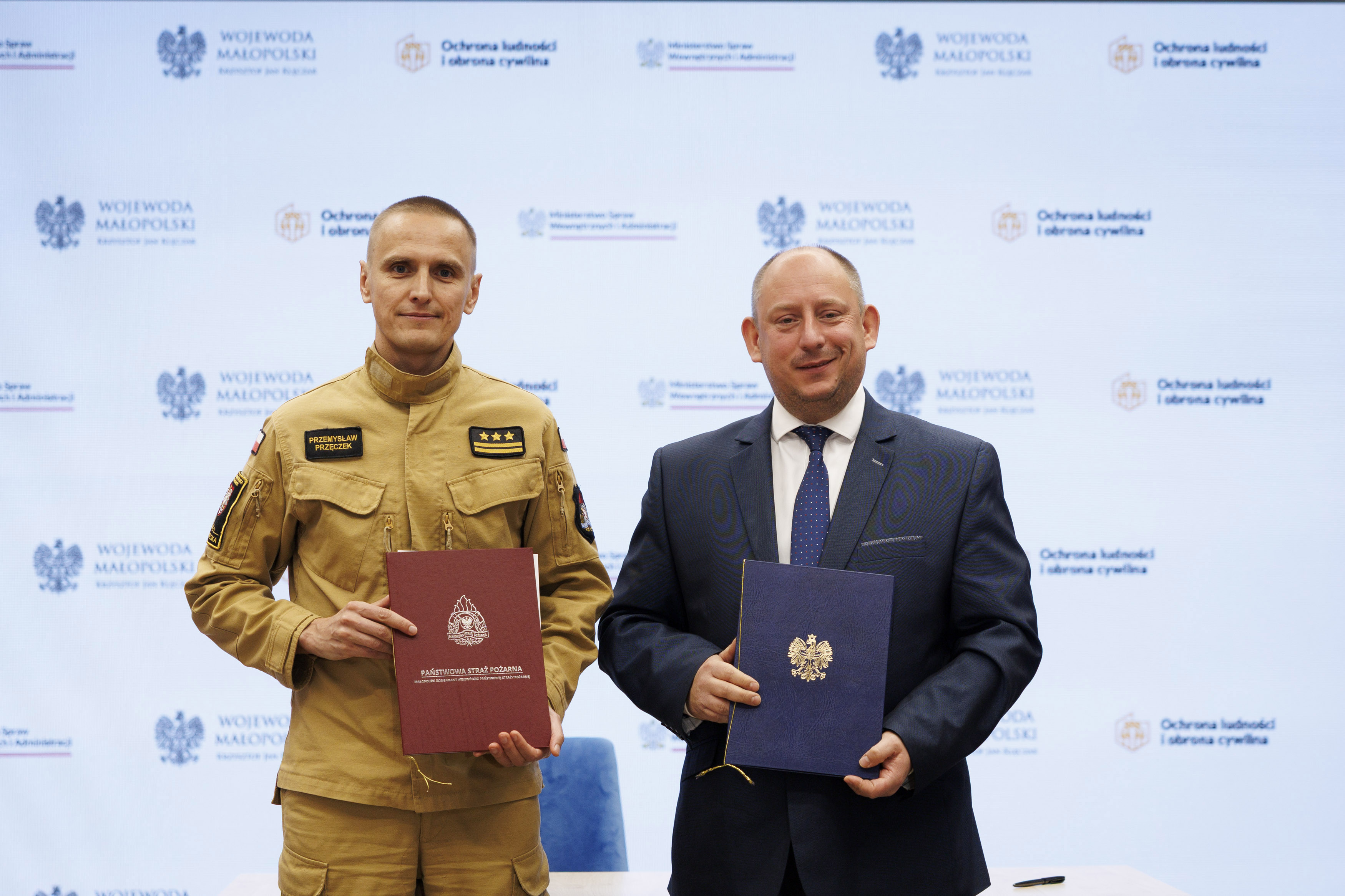 Aby dodatkowo wzmocnić i rozszerzyć w Małopolsce system powiadamiania, ostrzegania i alarmowania ludności o zagrożeniach, wojewoda małopolski Krzysztof Jan Klęczar podpisał dziś w Małopolskim Urzędzie Wojewódzkim w Krakowie porozumienie o współpracy z małopolskim komendantem wojewódzkim Państwowej Straży Pożarnej st. bryg. Przemysławem Przęczkiem.