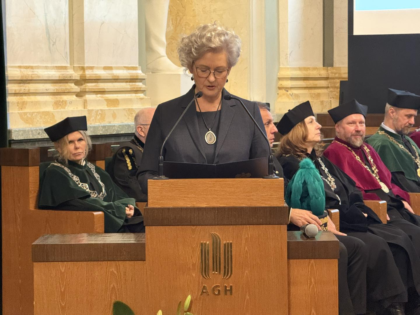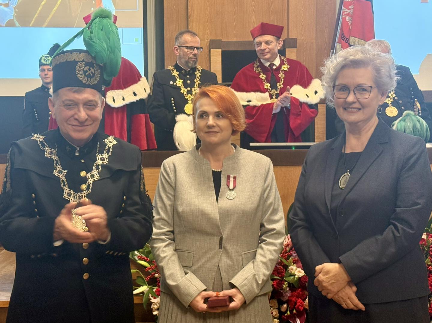 Wicewojewoda Elżbieta Achinger wręczyła również podczas uroczystości odznaczenie państwowe. Za wzorowe, wyjątkowo sumienne wykonywanie obowiązków wynikających z pracy zawodowej Srebrnym Medalem za Długoletnią Służbę odznaczona została prof. dr hab. Edyta Proniewicz z Wydziału Odlewnictwa AGH.