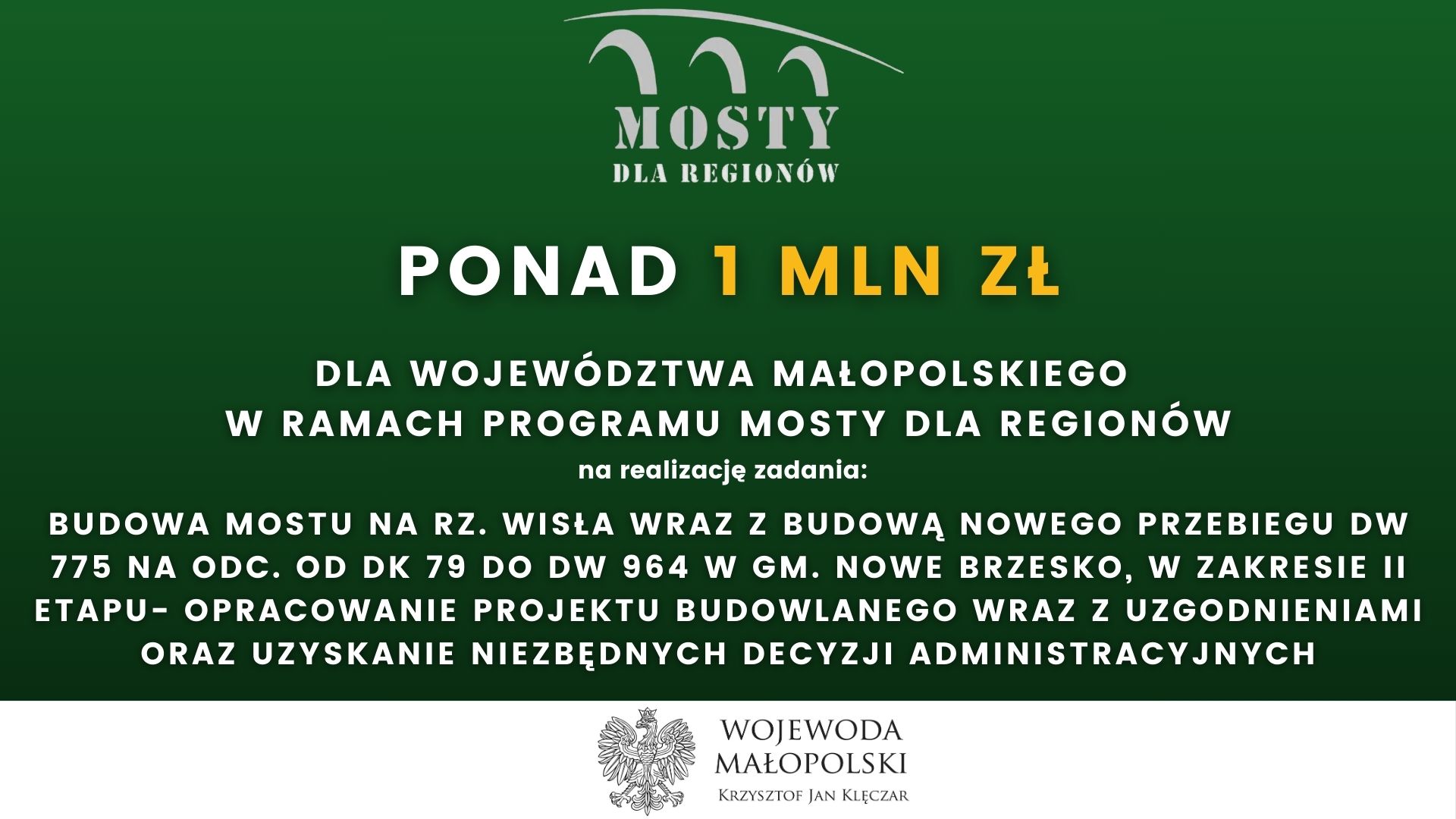 Środki pozwolą na realizację II etapu budowy mostu na Wiśle wraz z budową nowego przebiegu drogi wojewódzkiej nr 775 w gminie Nowe Brzesko. Etap ten polega na opracowaniu projektu budowlanego wraz z uzgodnieniami oraz uzyskanie wszystkich niezbędnych decyzji administracyjnych (w tym ZRID – zezwolenie na realizację inwestycji drogowej).