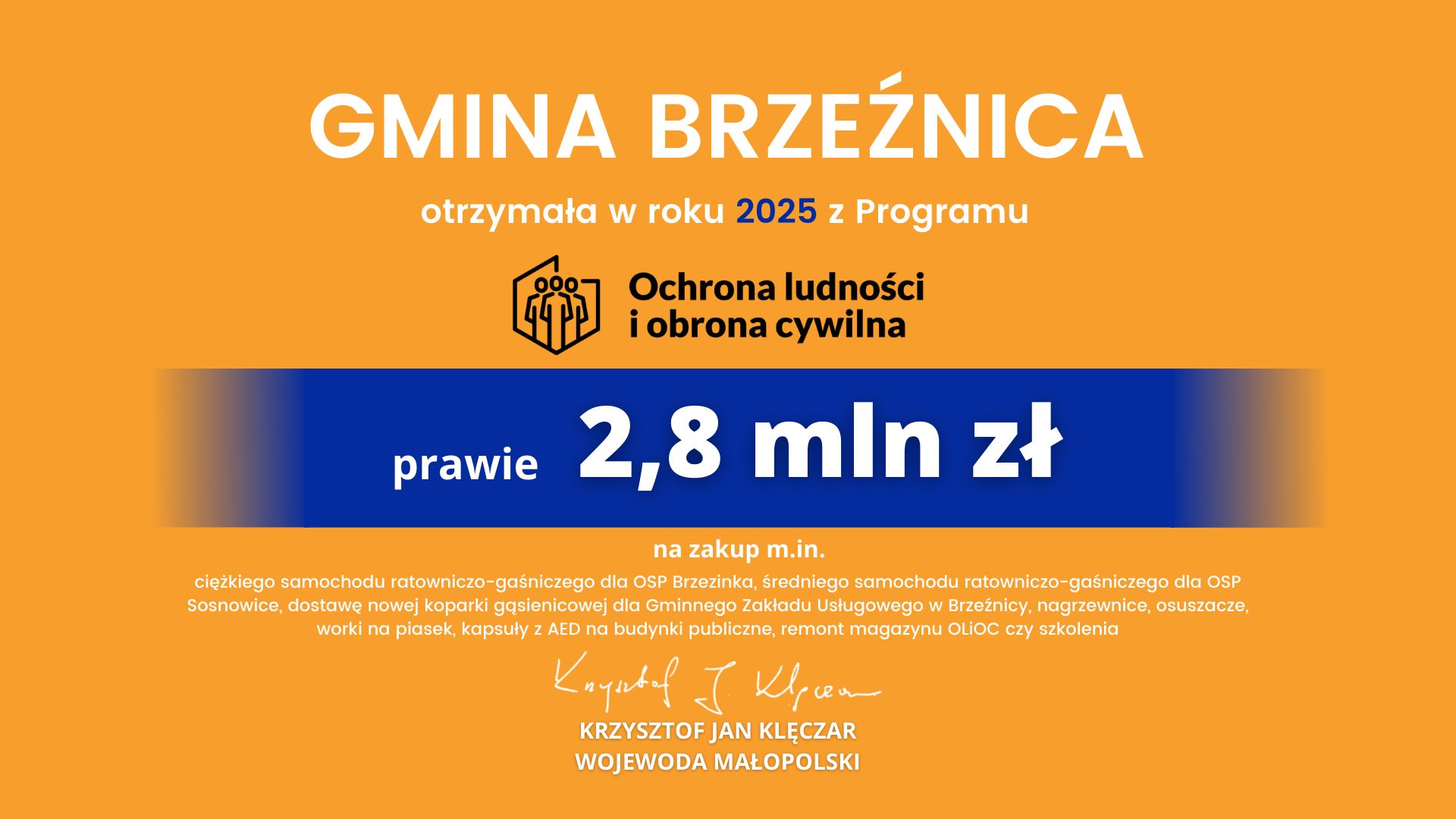 Gmina Brzeźnica z Programu OLiOC otrzymała łącznie blisko 2,8 mln zł – ponad 2,5 mln na zadania inwestycyjne oraz ok. 300 tys. na zadania bieżące. Środki wykorzystane zostaną m.in. na zakup średniego samochodu ratowniczo-gaśniczego dla OSP Sosnowice, dostawę nowej koparki gąsienicowej dla Gminnego Zakładu Usługowego w Brzeźnicy, nagrzewnice, osuszacze, worki na piasek, kapsuły z AED na budynki publiczne, remont magazynu OLiOC czy szkolenia.