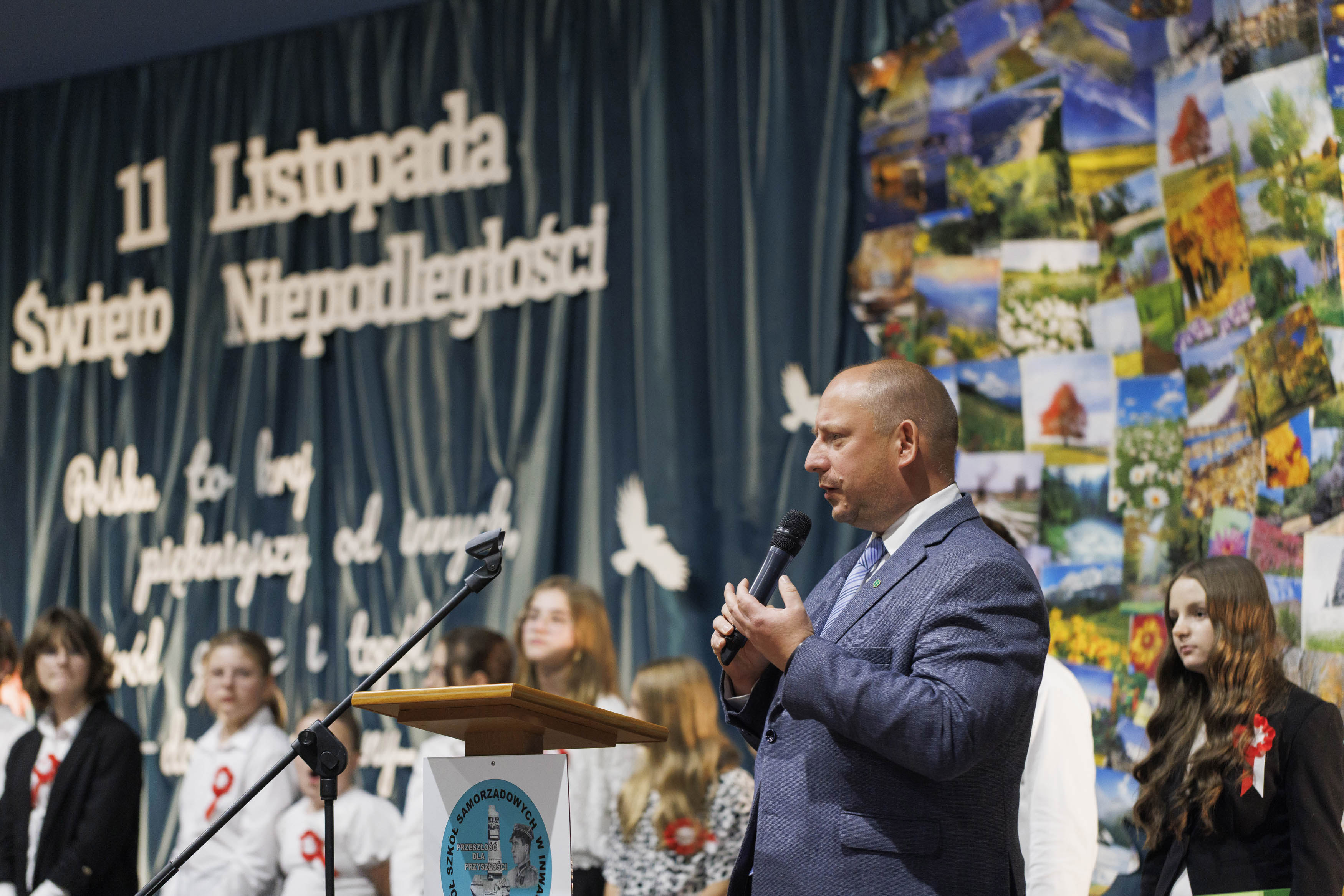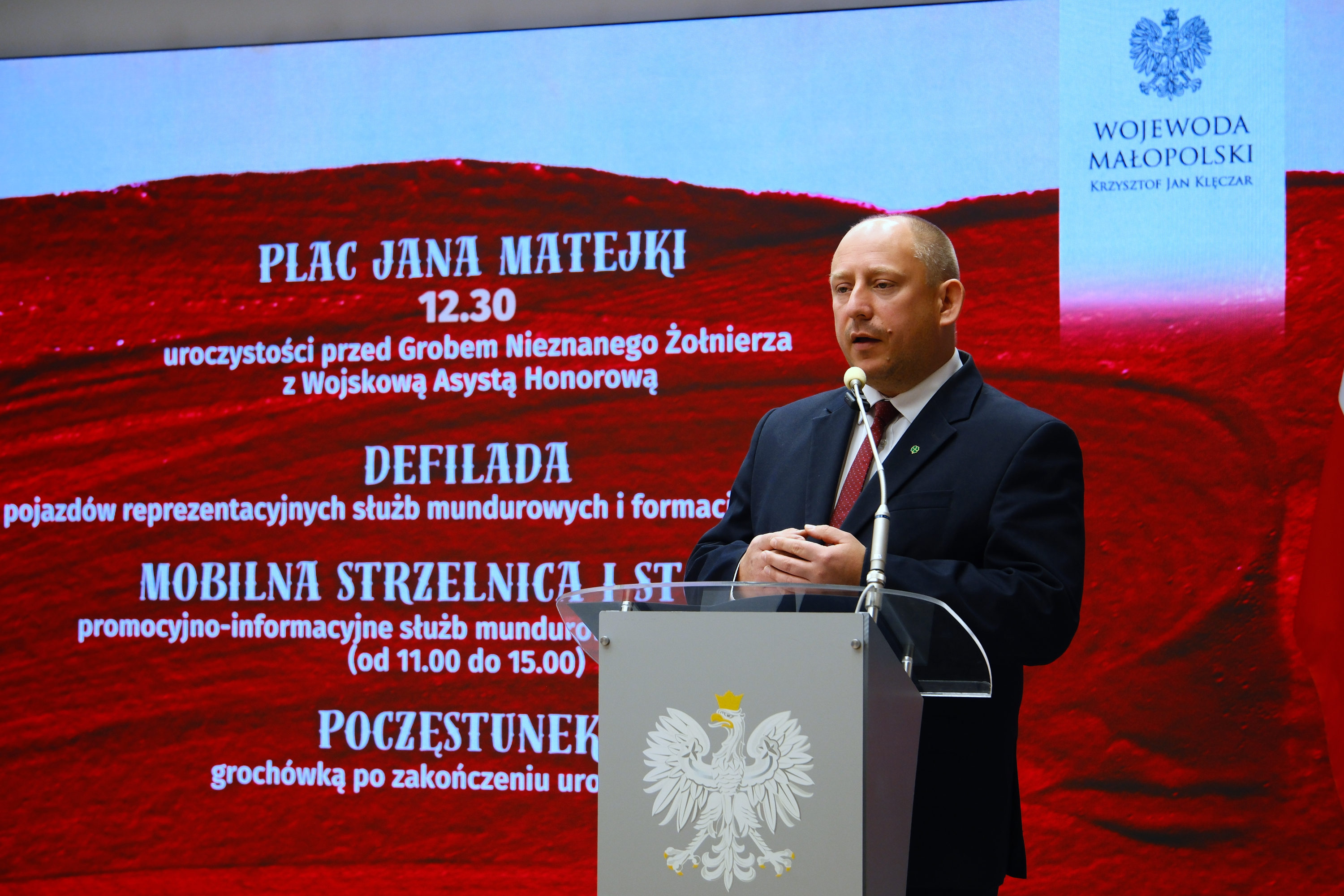 Na zdjęciu wojewoda małopolski Krzysztof Jan Klęczar przemawiający przy ambonie do mikrofonu. W tle na ścianie ekran z wyświetlonym napisem: wojewoda małopolski Krzysztof Jan Klęczar zaprasza na Narodowe Święto Niepodległości.