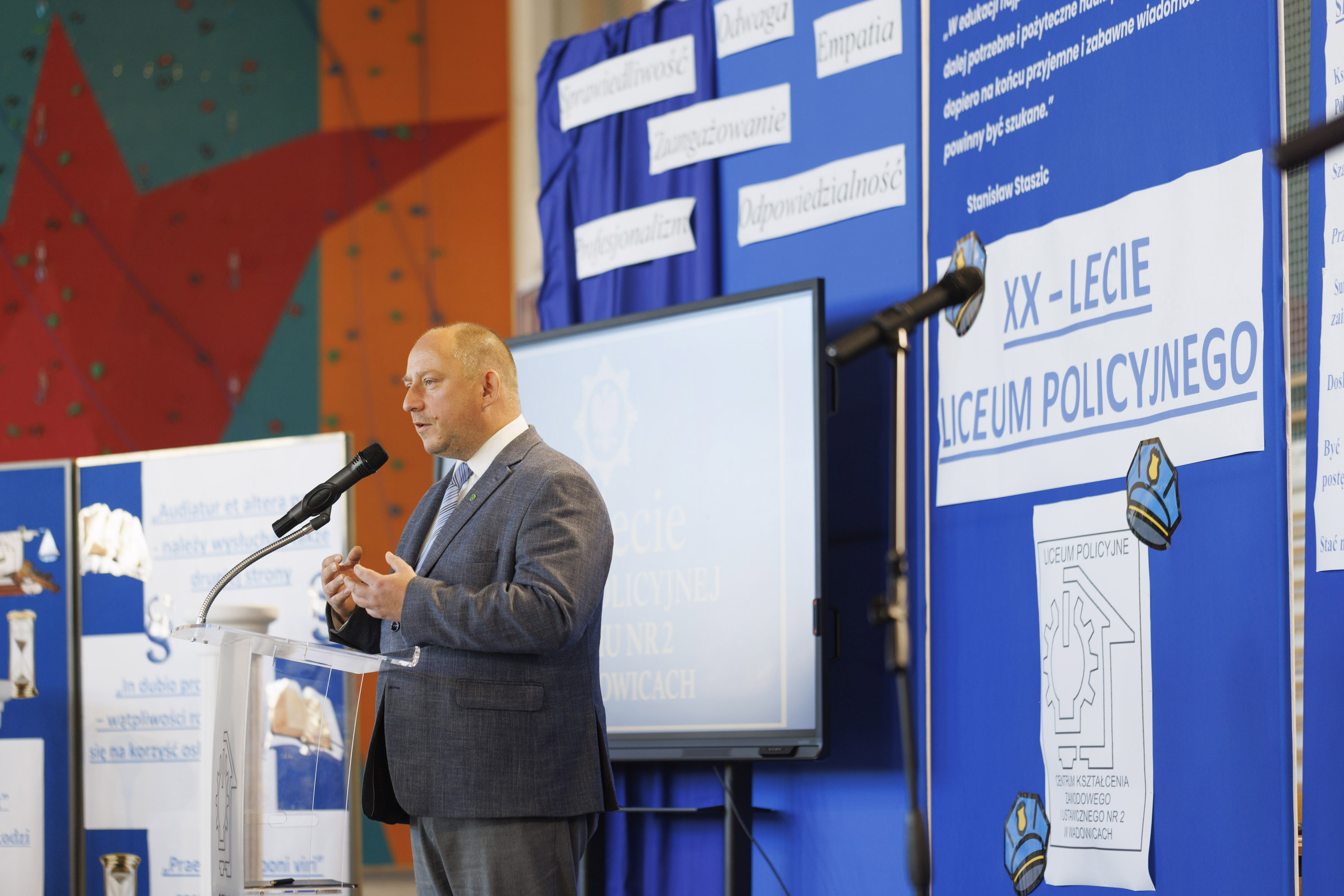 20 lat klas policyjnych w Wadowicach. Na zdjęciu wojewoda małopolski Krzysztof Jan Klęczar podczas przemówienia, widoczni są także uczniowie