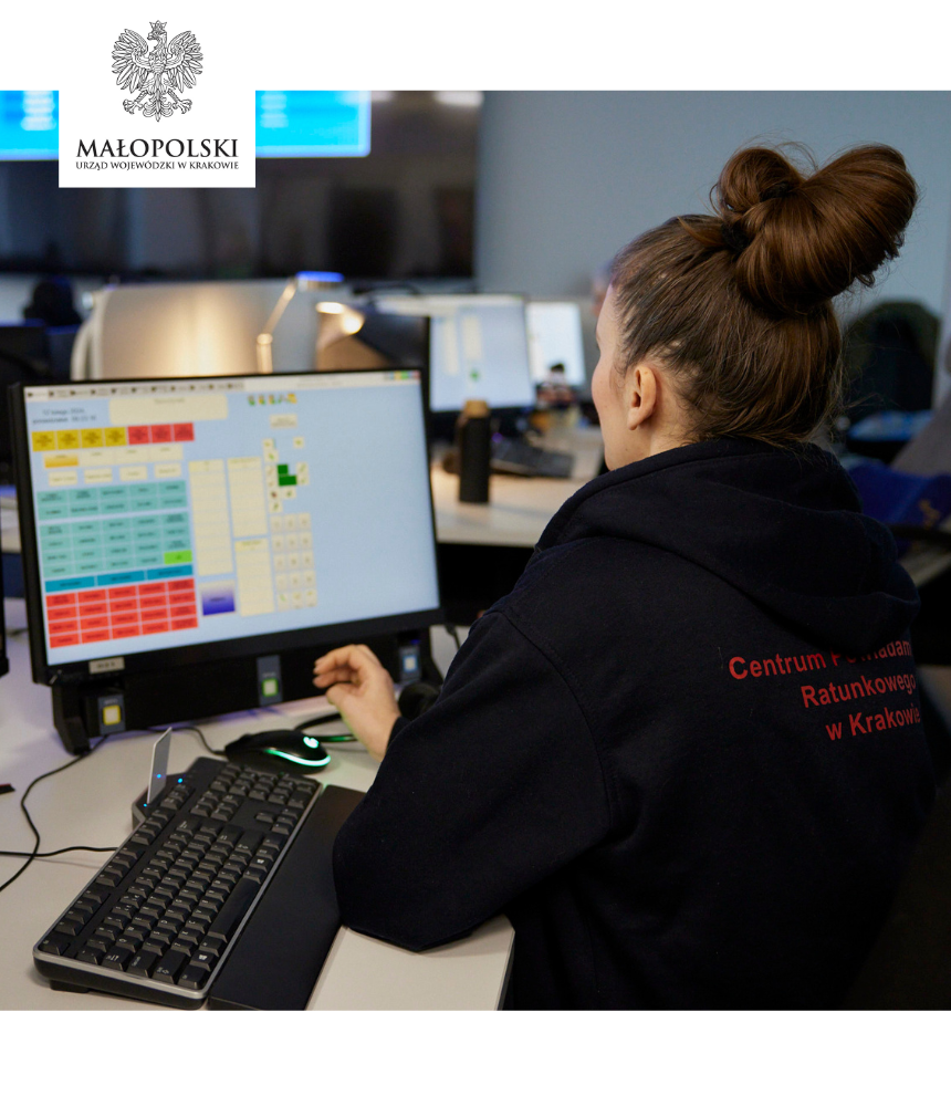 Na zdjęciu sala operatorów numeru alarmowego 112. Widoczny monitor do obsługi zgłoszeń. Przed monitorem, tyłem do zdjęcia siedzi kobieta ubrana w polar z napisem na plecach Centrum Powiadamiania Ratunkowego w Krakowie.