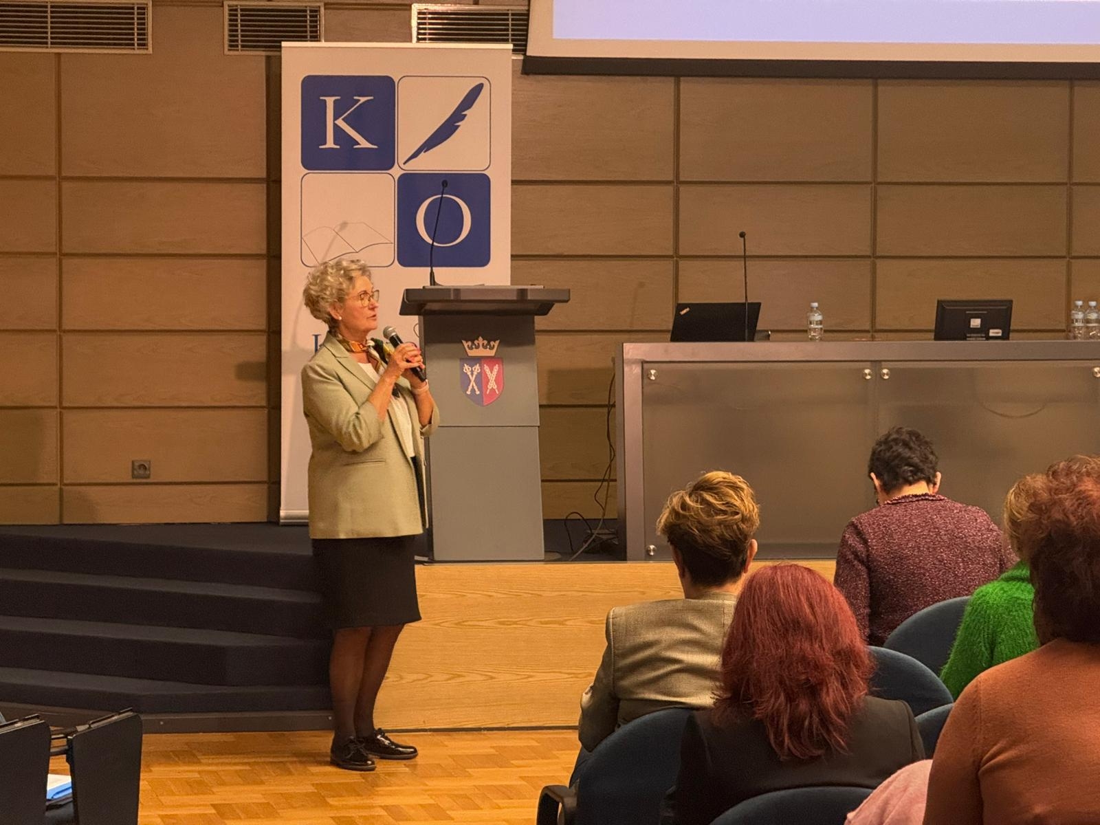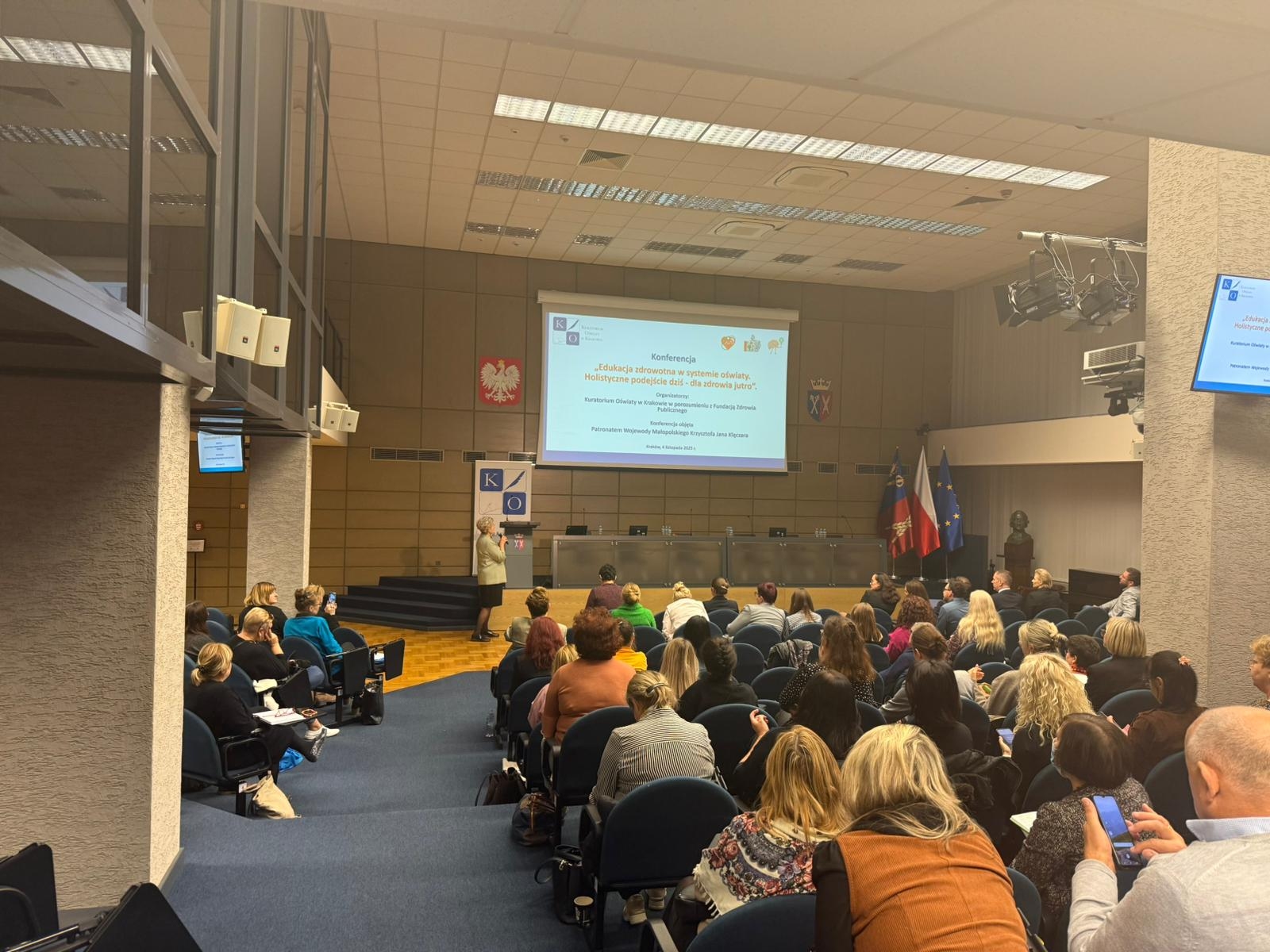 I wicewojewoda Elżbieta Achinger wraz z uczestnikami konferencji. Na ubraniu posiadają różowe wstążki - symbol walki z rakiem piersi.