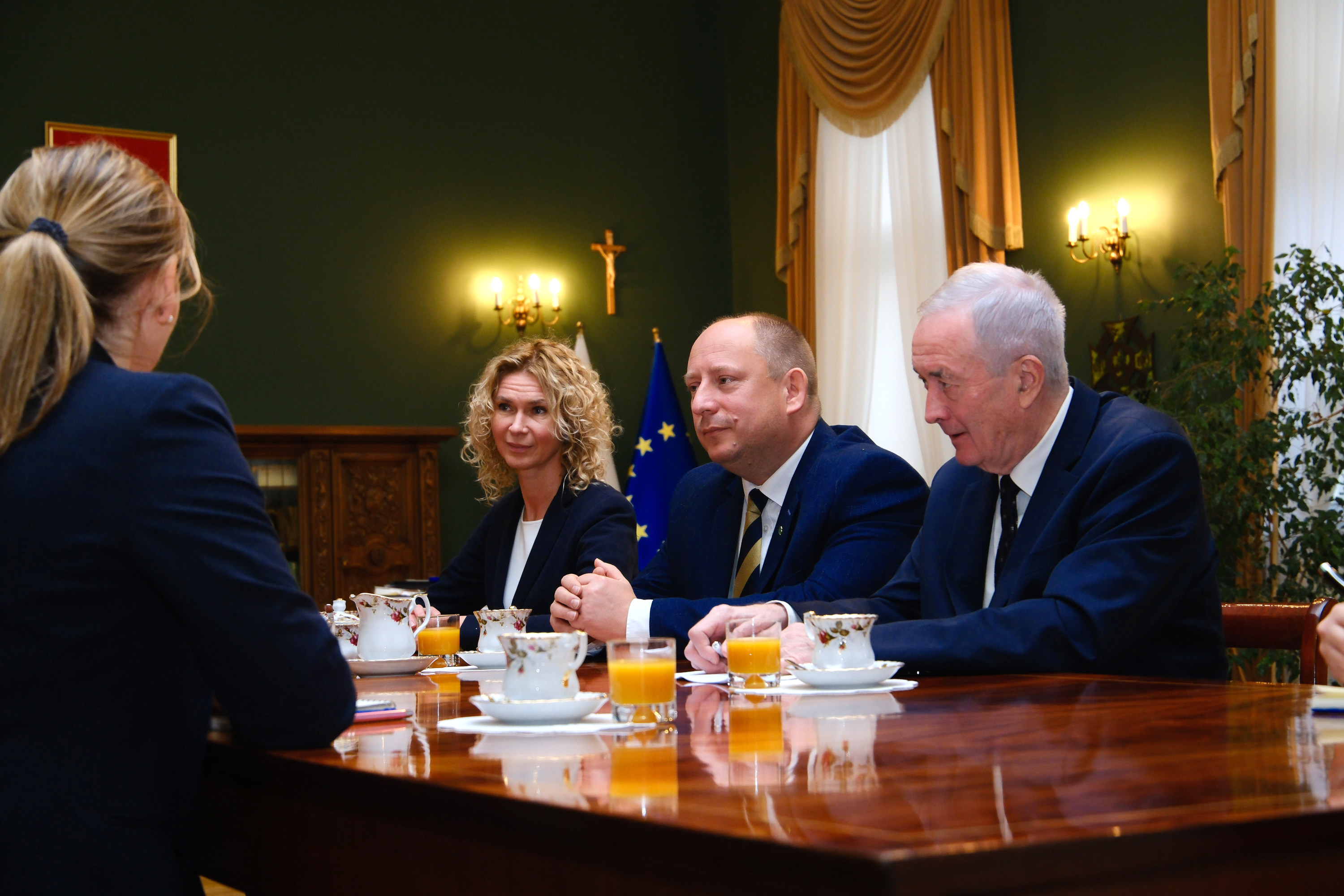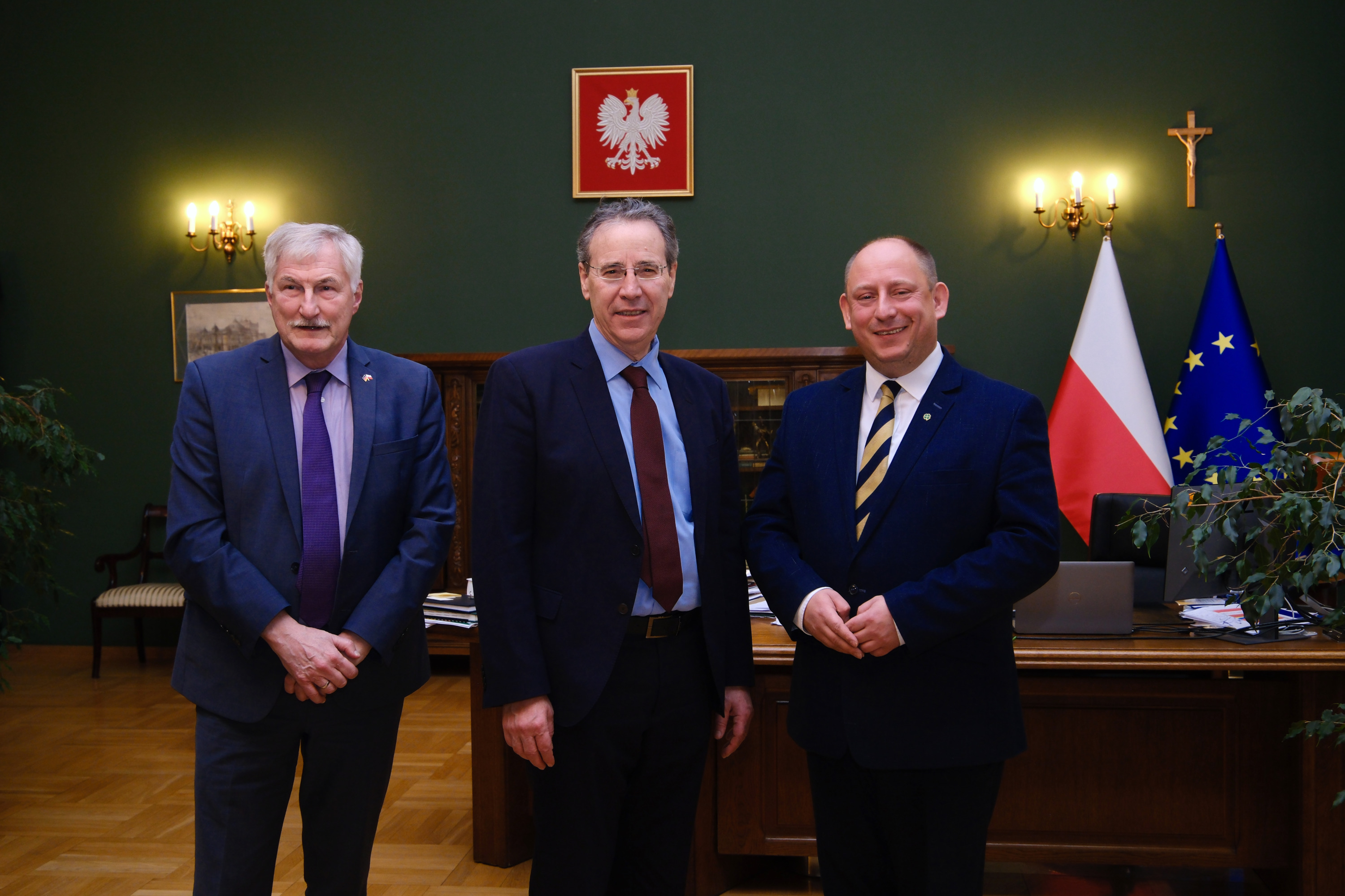 Na zdjęciu gabinet wojewody małopolskiego. Przed biurkiem stoją od prawej: wojewoda małopolski Krzysztof Jan Klęczar, ambasador nadzwyczajny i pełnomocny Republiki Federalnej Niemiec w Polsce Miguel Berger, konsul generalny Republiki Federalnej Niemiec w Krakowie Holger Mahnicke.
