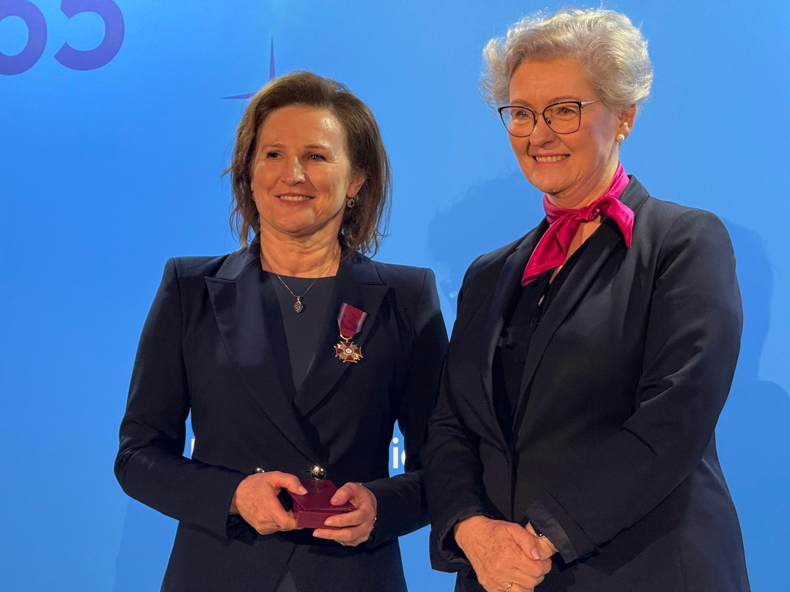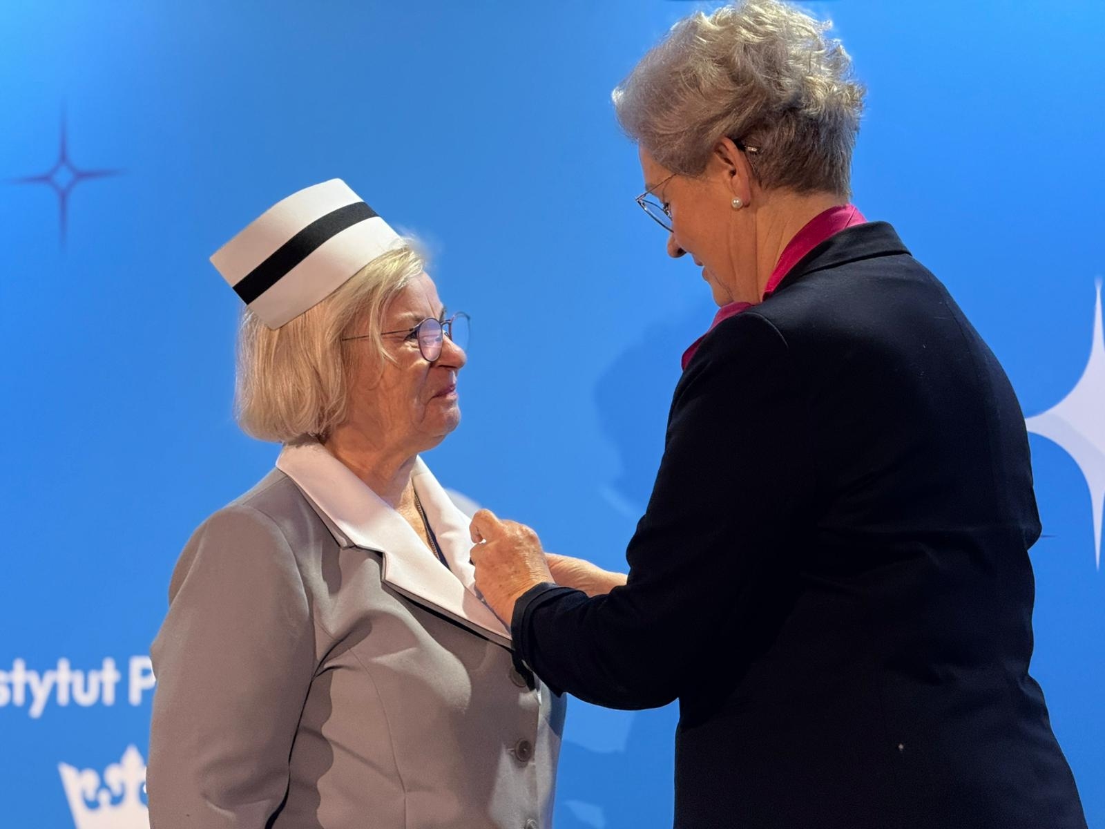 Na zdjęciu I wicewojewoda małopolska Elżbieta Achinger, wręczająca odznaczenie kobiecie. W tle niebieskie tło.