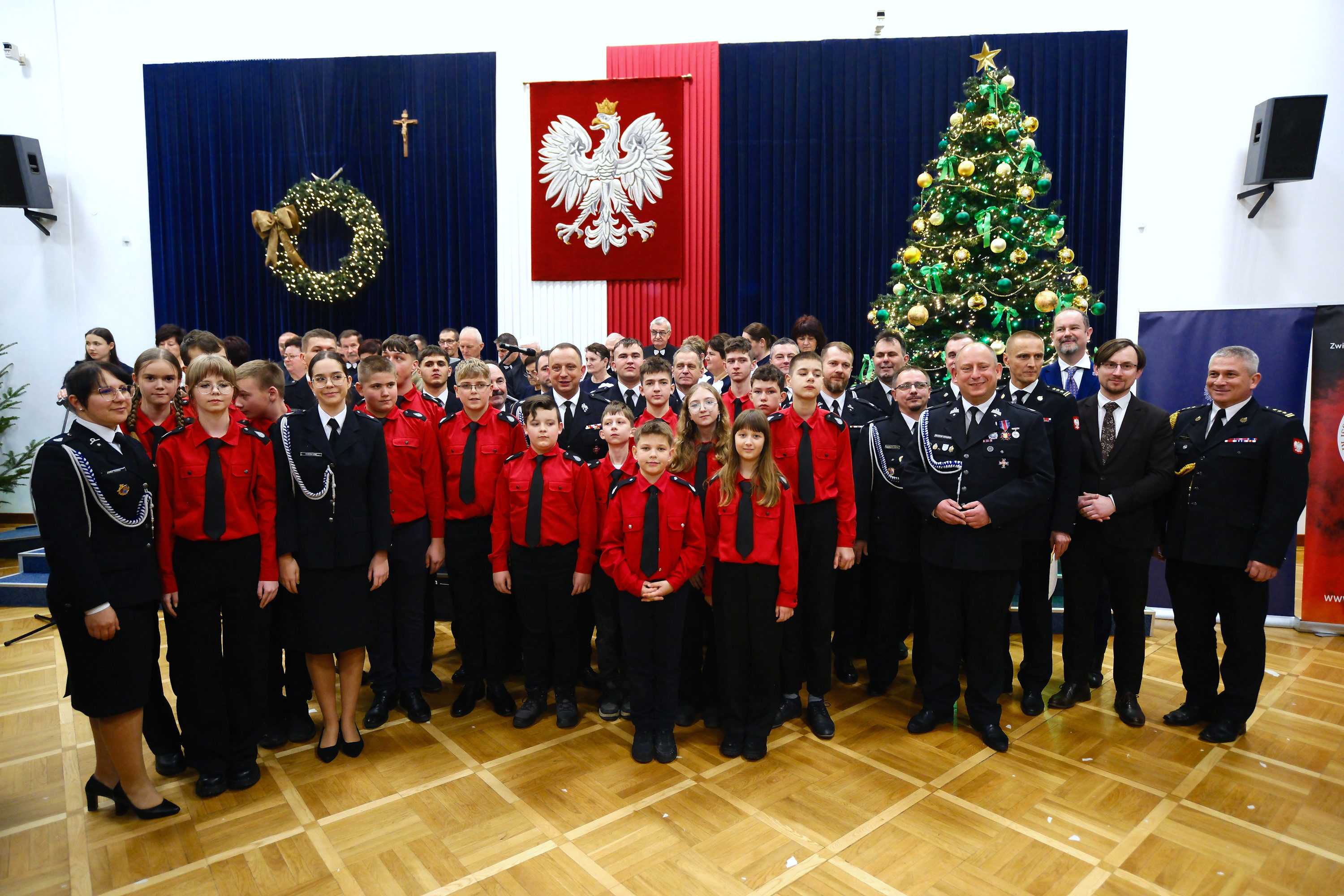 Wojewoda Krzysztof Jan Klęczar oraz strażacy i strażaczki na grupowym zdjęciu podczas spotkania opłatkowego w Tarnowie