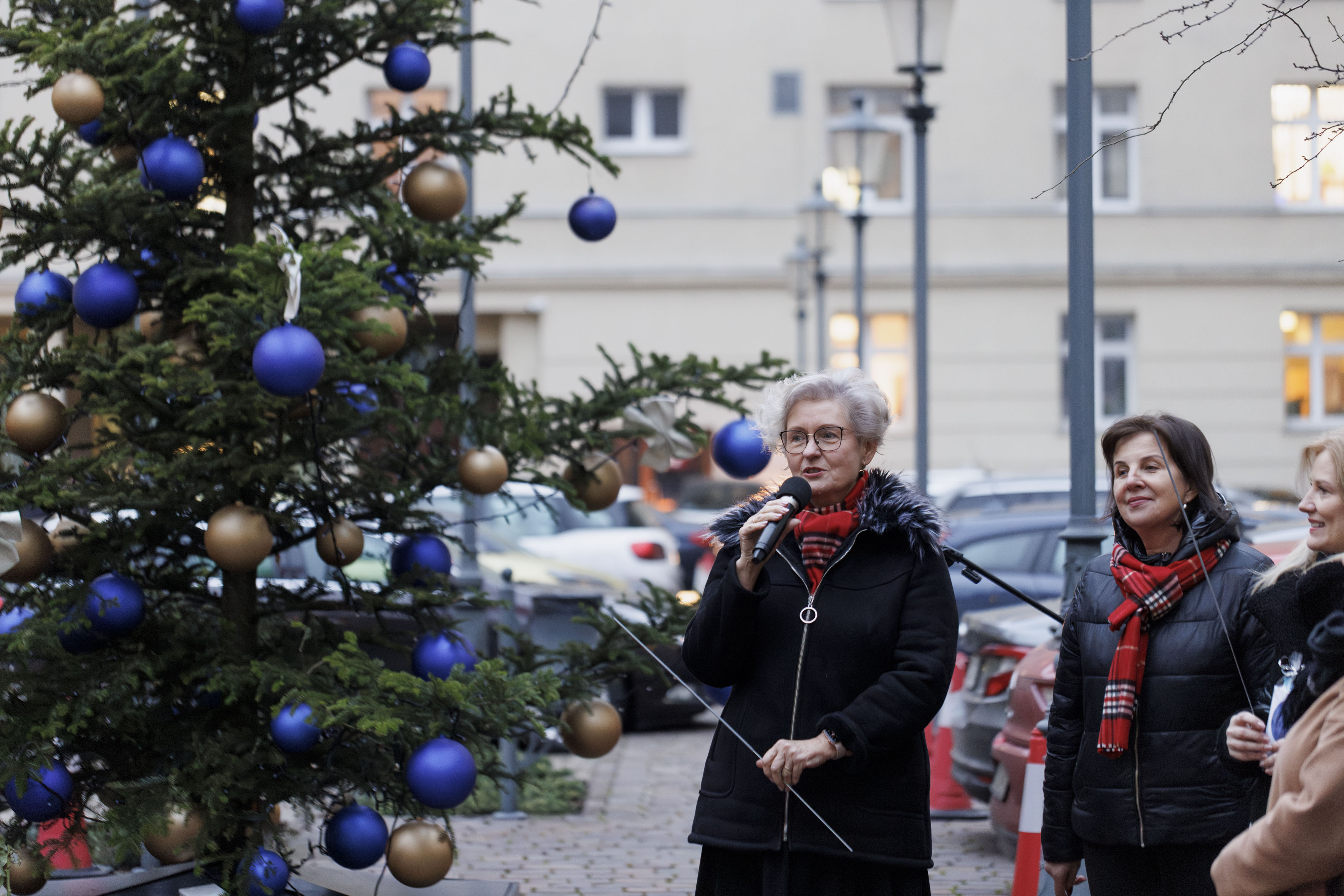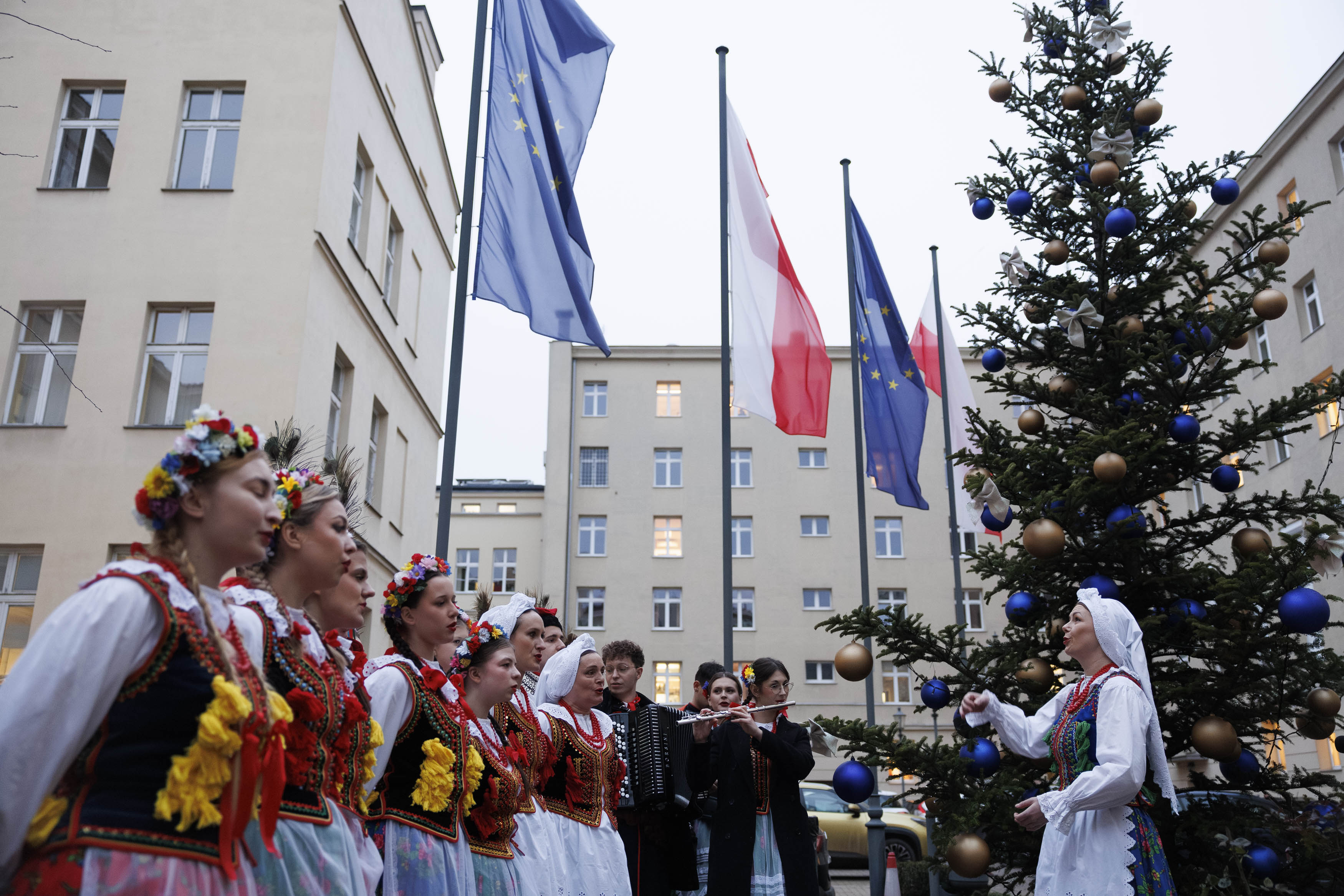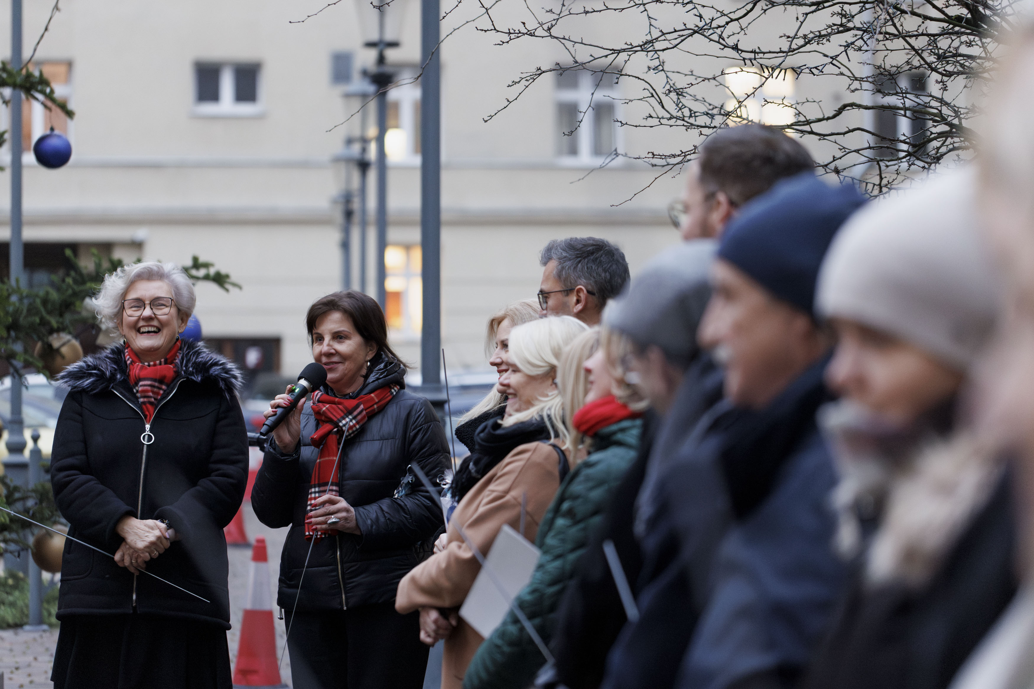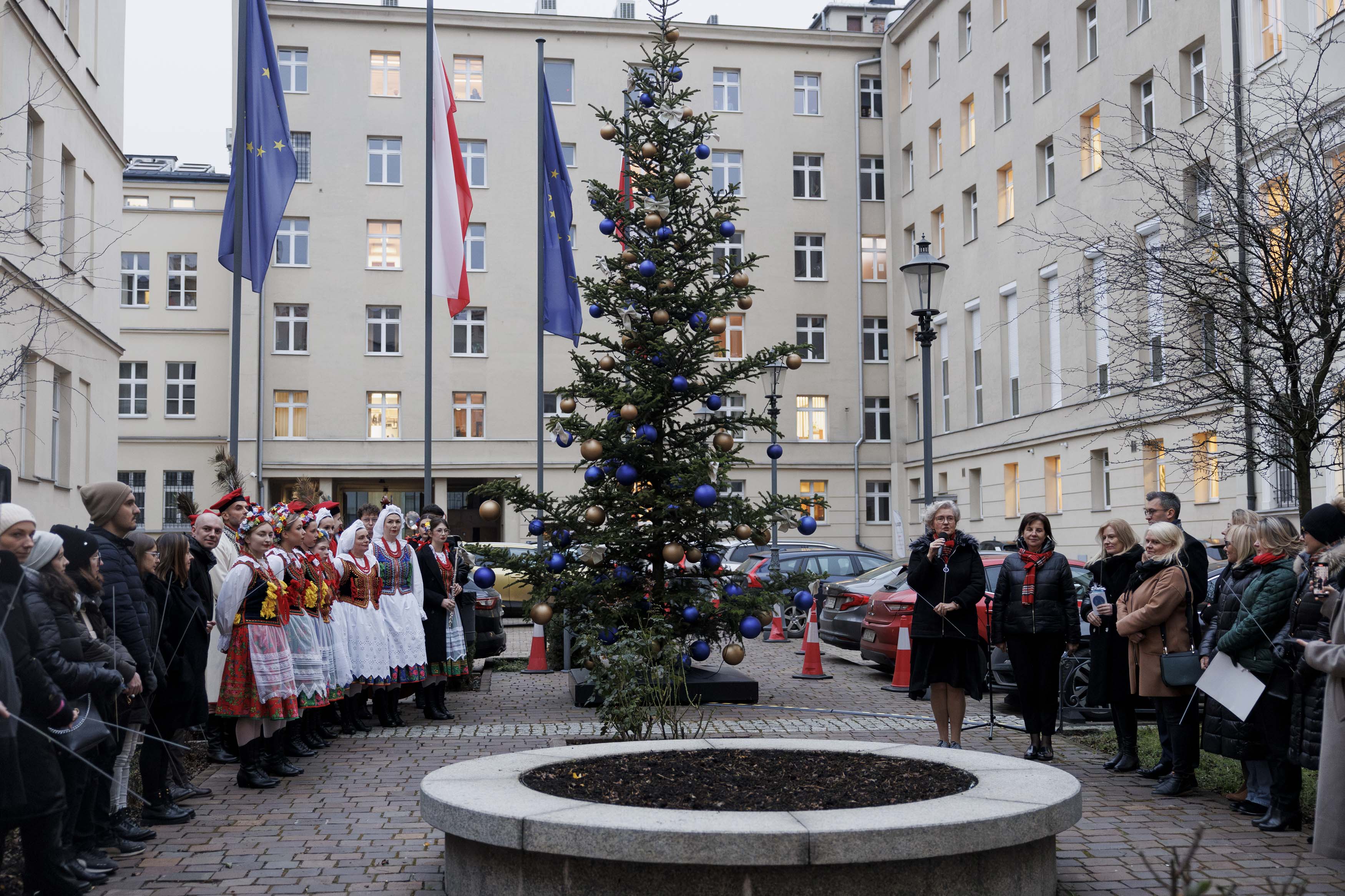 Pracownicy Małopolskiego Urzędu Wojewódzkiego w Krakowie stoją wokół dużej choinki na środku urzędowego dziedzińca