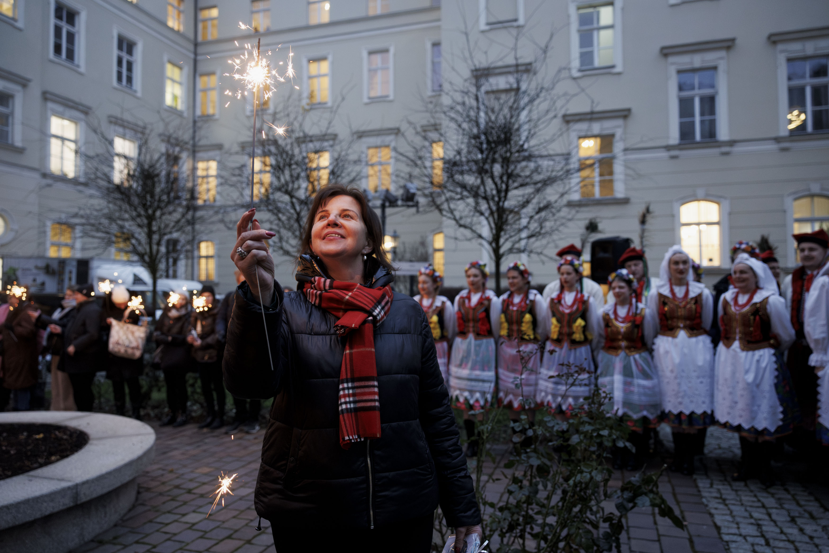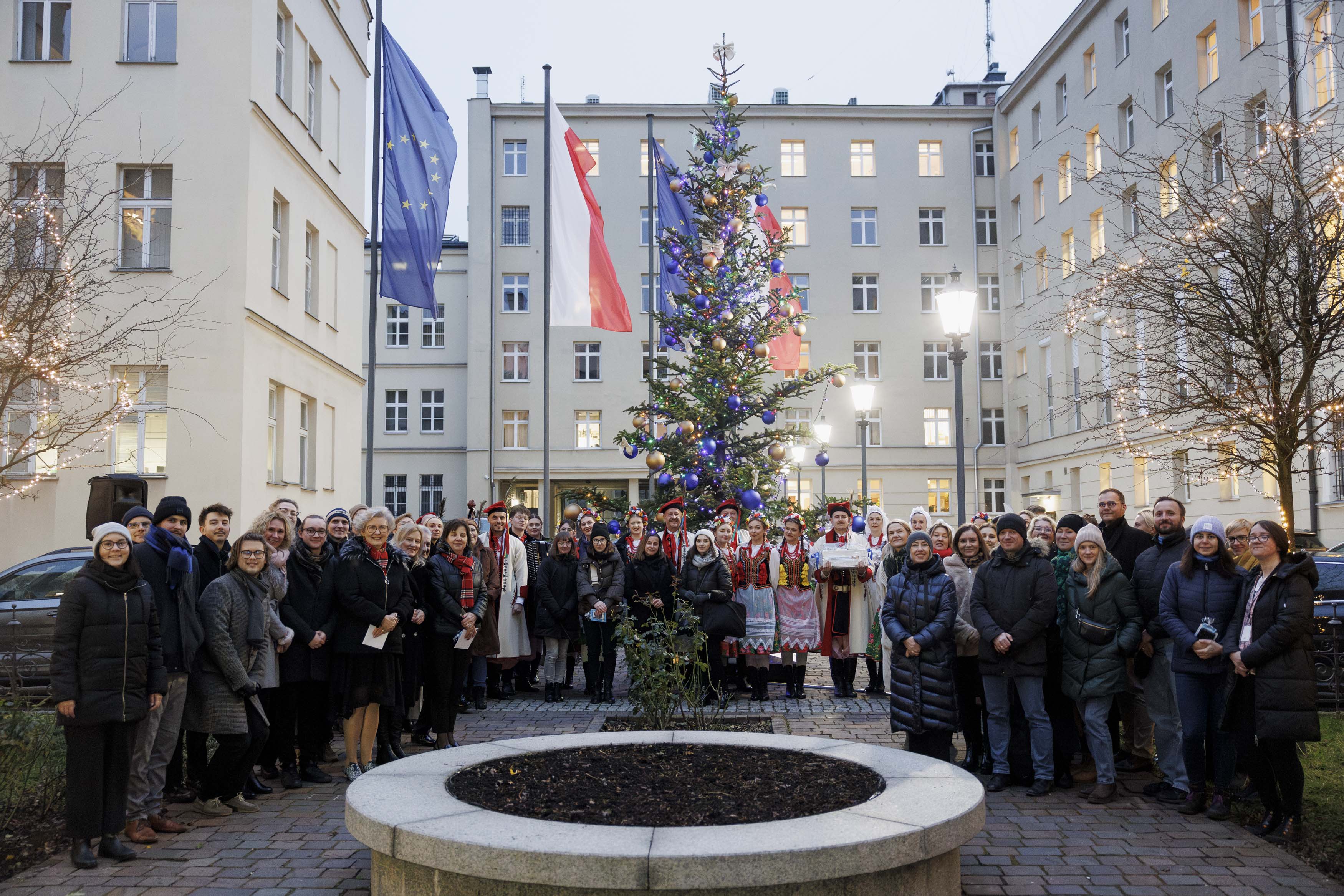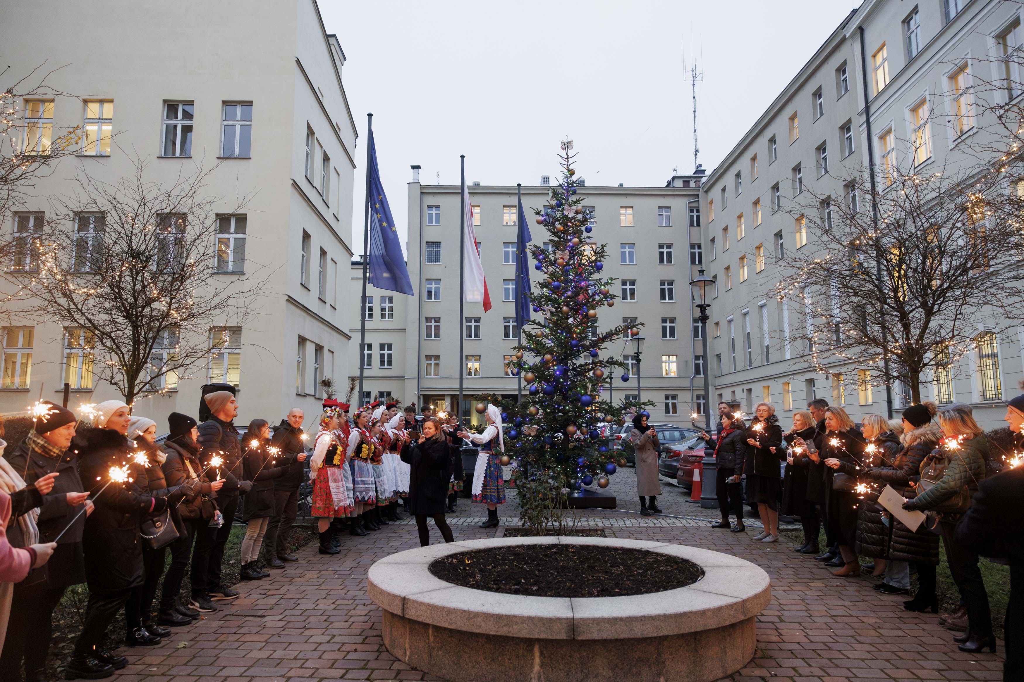 Dwa dni przed Wigilią, kiedy zapadał mrok, pracownicy Małopolskiego Urzędu Wojewódzkiego w Krakowie zgromadzili się na dziedzińcu, by uczestniczyć w uroczystym zapaleniu światełek na naszej choince. Spotkanie odbyło się przy akompaniamencie kolęd i przyśpiewek świątecznych w wykonaniu Zespołu Pieśni i Tańca „Miechowiacy”.