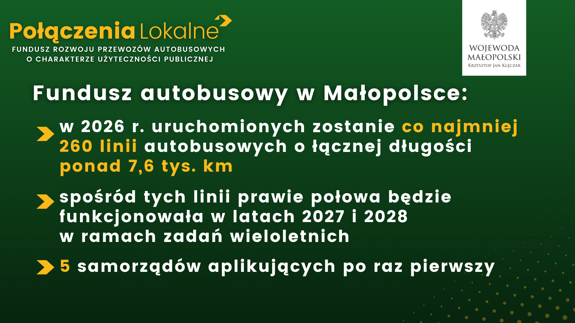 Co najmniej 260 linii autobusowych będzie uruchomionych w naszym województwie w 2026 r. dzięki środkom z Funduszu autobusowego. Jesteśmy w trakcie zawierania umów, na podstawie których przekazywane jest rządowe dofinansowanie umożliwiające funkcjonowanie tych połączeń lokalnych.