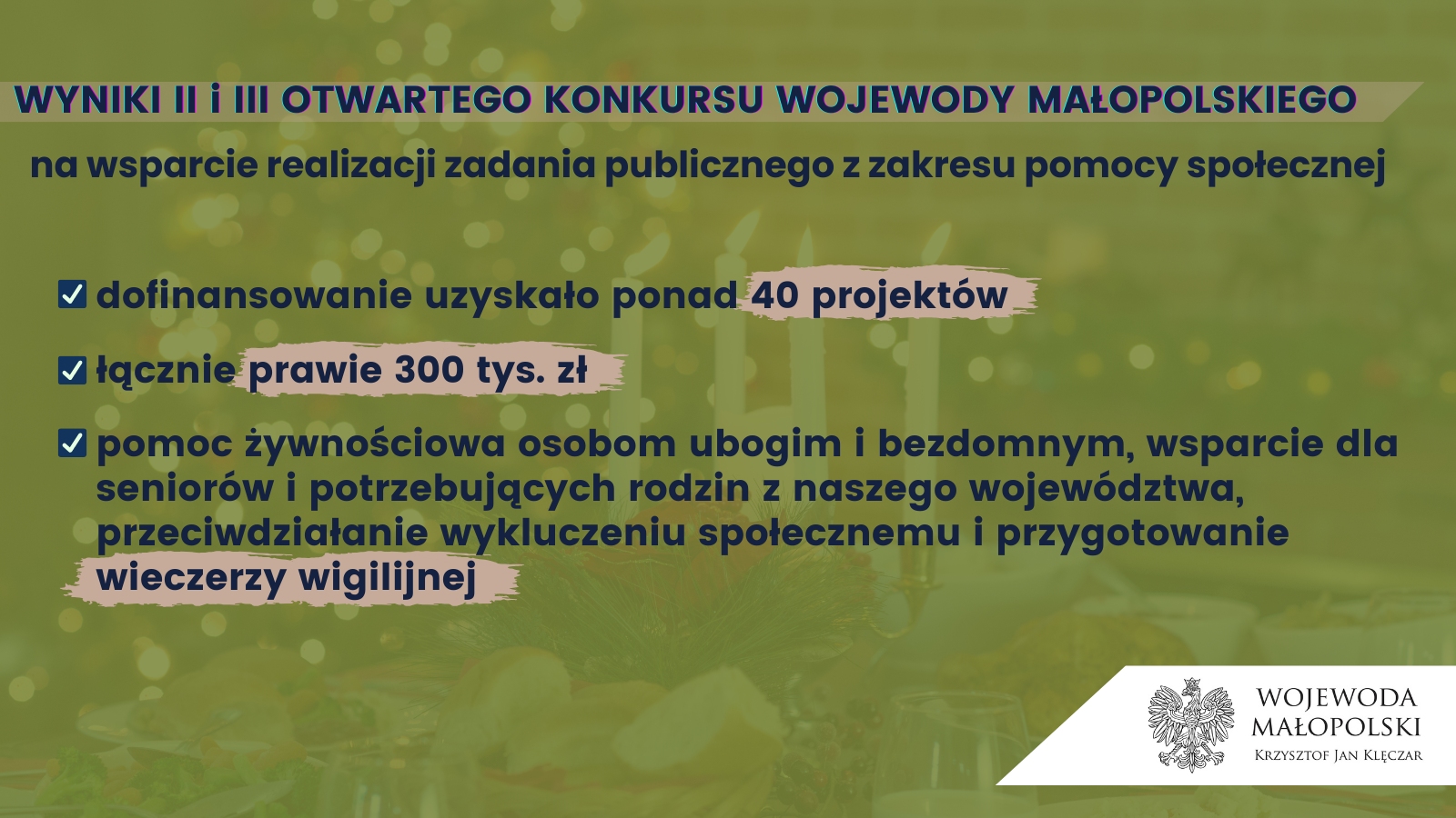 grafika na której znajdują się informacje o wynikach otwartego konkursu Wojewody Małopolskiego.