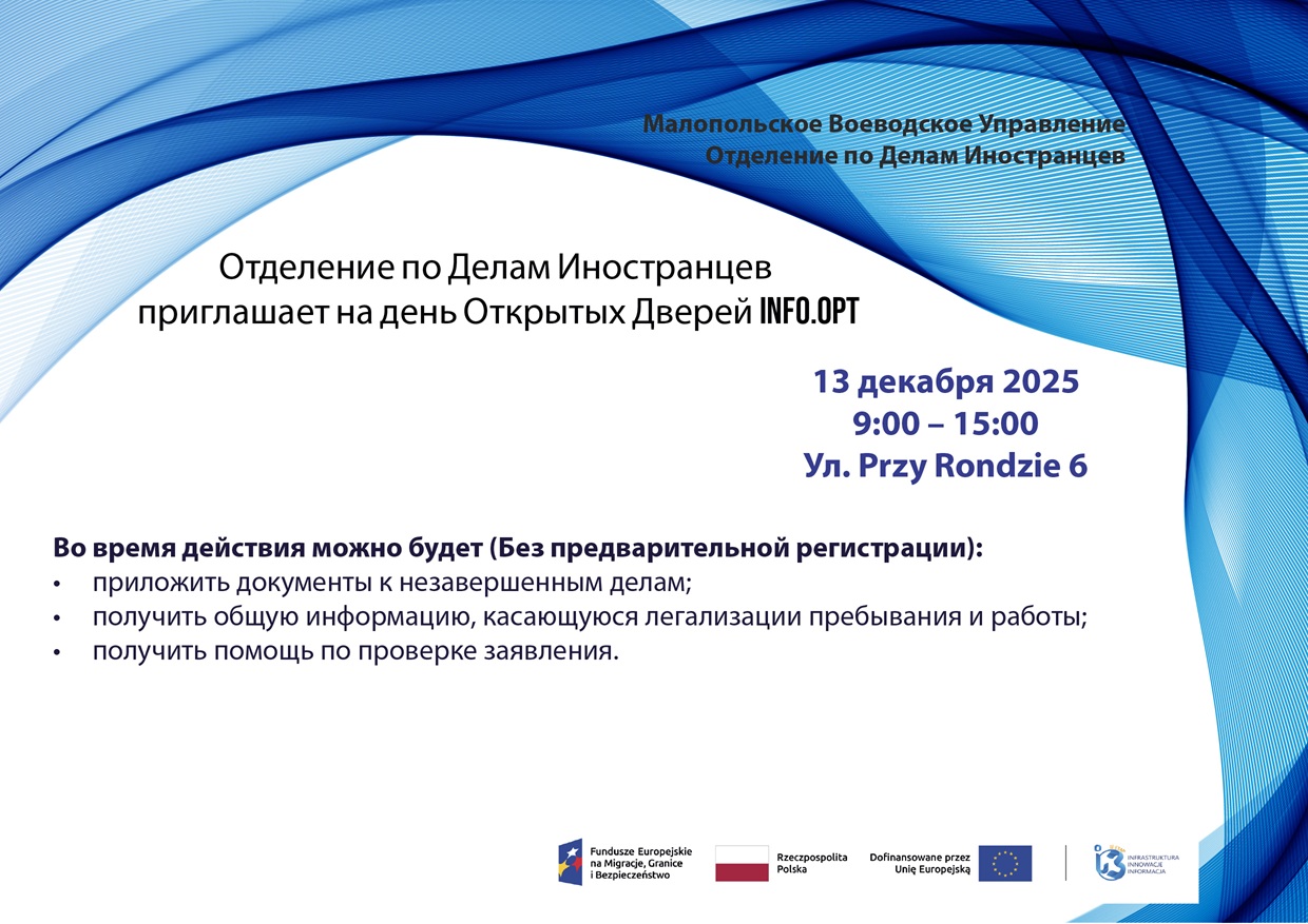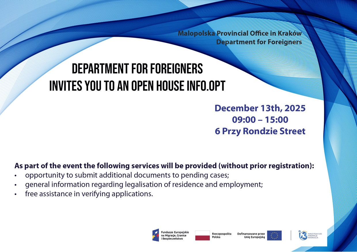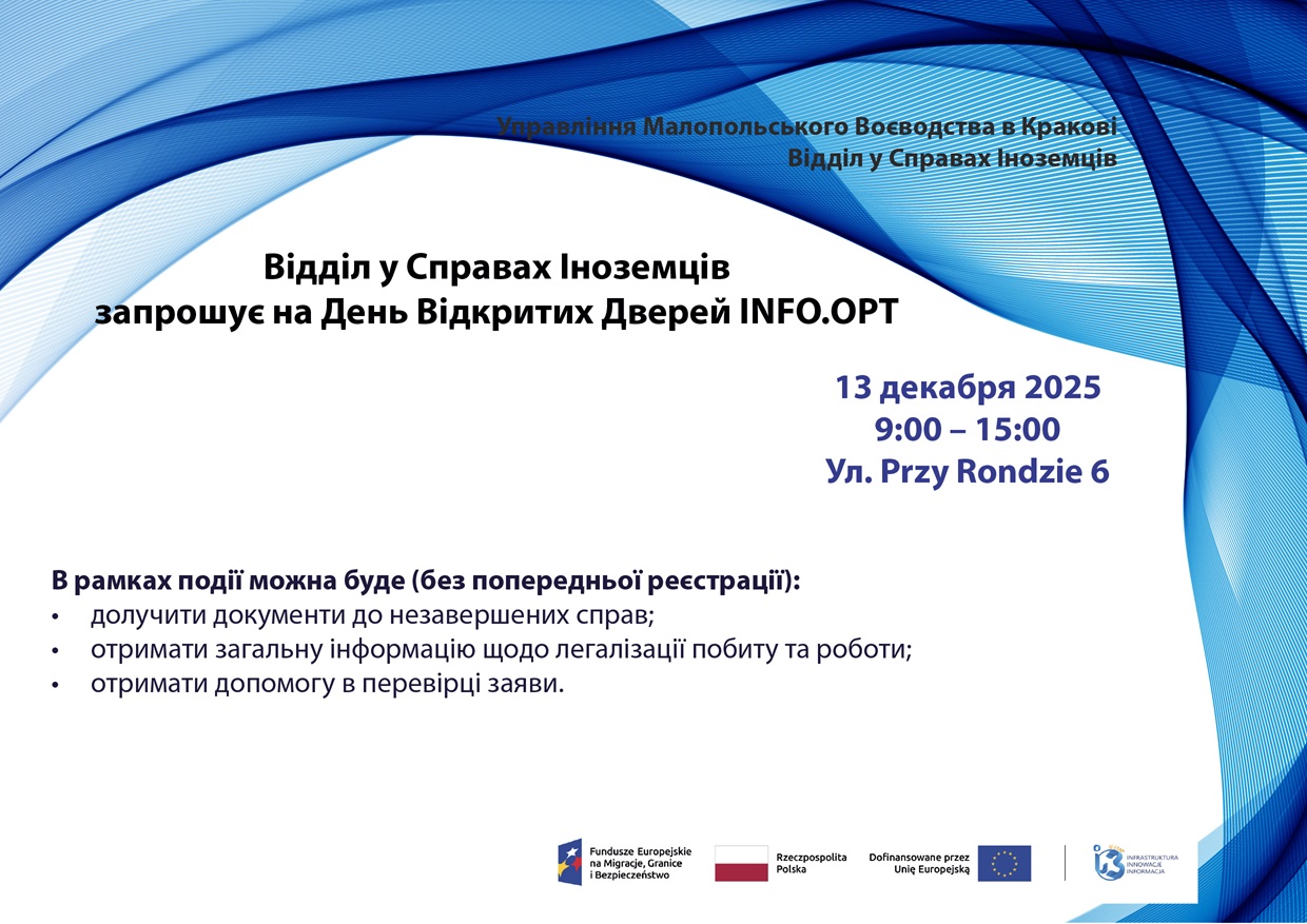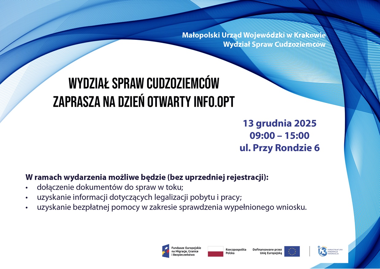 Wydział Spraw Cudzoziemców Małopolskiego Urzędu Wojewódzkiego w Krakowie zaprasza na „Dzień otwarty INFO.OPT”. Wydarzenie odbędzie się w sobotę 13 grudnia 2025 r., w godzinach od 9:00 do 15:00, w siedzibie Wydziału Spraw Cudzoziemców Małopolskiego Urzędu Wojewódzkiego w Krakowie (ul. Przy Rondzie 6).