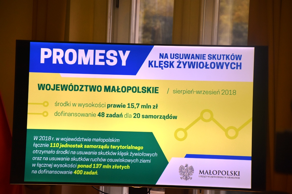 Pod koniec sierpnia małopolskie samorządy, w ramach podziału środków budżetu państwa na usuwanie skutków klęsk żywiołowych, otrzymały promesy na kwotę 11 750 000,00 złotych. Promesy przyznano 19 jednostkom samorządu terytorialnego, w tym 18 gminom oraz 1 powiatowi na realizację łącznie 41 zadań.