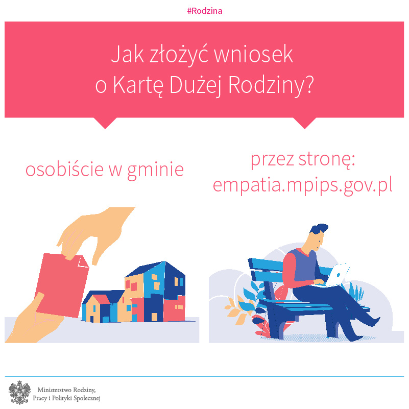 Wniosek o przyznanie Karty Dużej Rodziny można składać w gminie odpowiadającej miejscu zamieszkania lub dużo sprawniej i szybciej za pośrednictwem Platformy Informacyjno-Usługowej Emp@tia (www.empatia.mrpips.gov.pl).