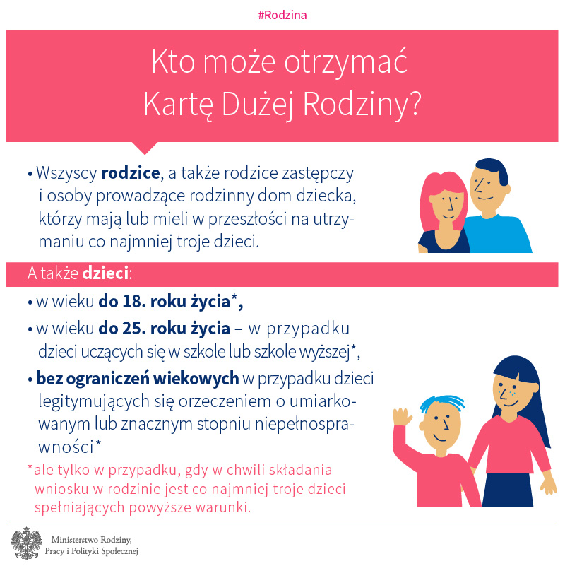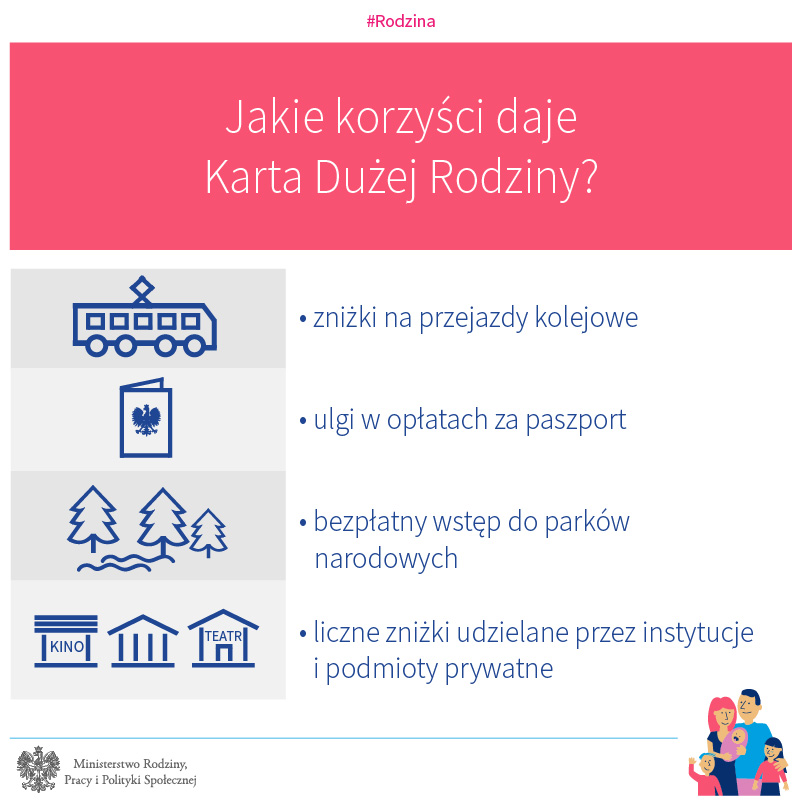 – Zdecydowaliśmy się na poszerzenie kręgu osób, które mogą korzystać z Karty Dużej Rodziny, ponieważ chcemy docenić trud, jaki rodzice włożyli w wychowanie trójki, czwórki czy większej liczby dzieci. W ostatnim czasie m.in. dzięki programowi „Rodzina 500+” sytuacja materialna dużych rodzin zdecydowanie się poprawiła. Nie możemy jednak zapominać o tych, którzy decydowali się na wychowywanie dużej liczby dzieci wcześniej. Właśnie dlatego od początku 2019 roku wszyscy, którzy wychowali co najmniej troje dzieci, mają prawo do zniżek – bez względu na to, w jakim wieku są dzisiaj te dzieci – wyjaśnia Elżbieta Rafalska, minister rodziny, pracy i polityki społecznej.