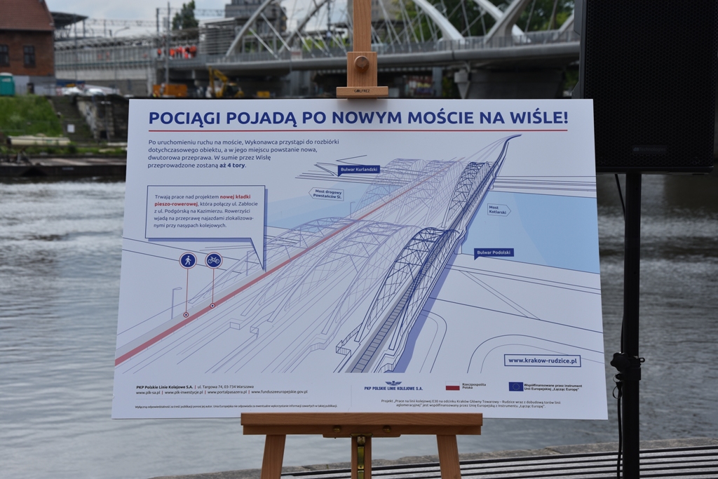 Wieczorem 29 maja składy kursujące linią średnicową z Krakowa Głównego do Krakowa Płaszowa pojadą przez nowy most kolejowy nad Wisłą. Tę dobrą wiadomość przekazali na briefingu prasowym minister infrastruktury Andrzej Adamczyk, wojewoda małopolski Piotr Ćwik, wicemarszałek województwa małopolskiego Łukasz Smółka oraz prezes Zarządu PKP Polskich Linii Kolejowych S.A. Ireneusz Merchel.
