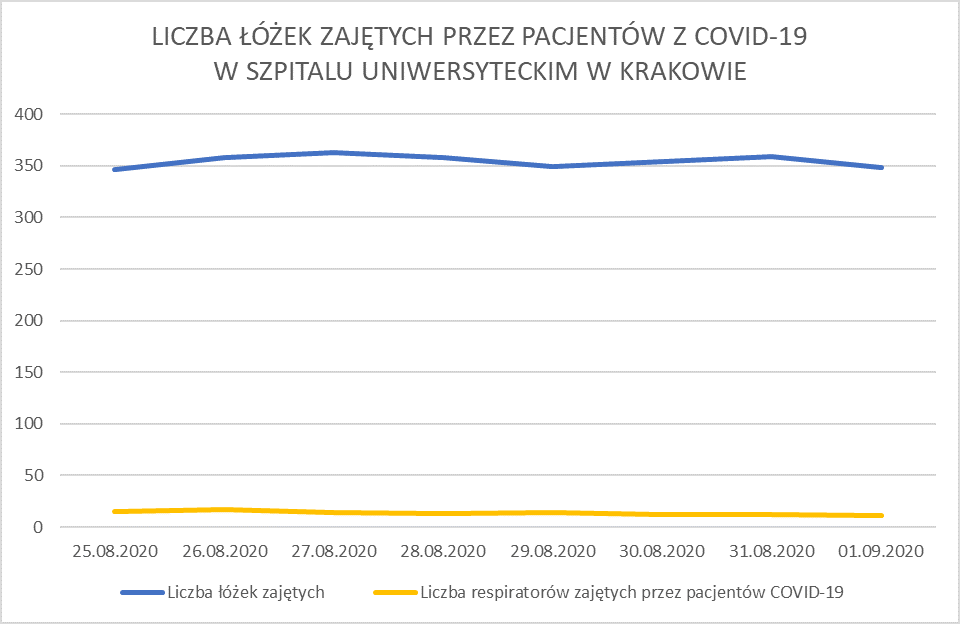 Wojewoda małopolski Łukasz Kmita wraz ze swoimi służbami na bieżąco monitoruje zabezpieczenie miejsc dla pacjentów zakażonych SARS-CoV-2 w województwie małopolskim. Jest także w stałym kontakcie z Ministerstwem Zdrowia oraz dyrektorami szpitali wojewódzkich i powiatowych. Dane dotyczące dostępności łóżek COVID-owych w Szpitalu Uniwersyteckim w Krakowie wskazują, że aktualnie nie występuje ryzyko braku miejsc dla osób wymagających hospitalizacji ze względu na zakażenie koronawirusem. Musimy jednak cały czas trzymać rękę na pulsie.