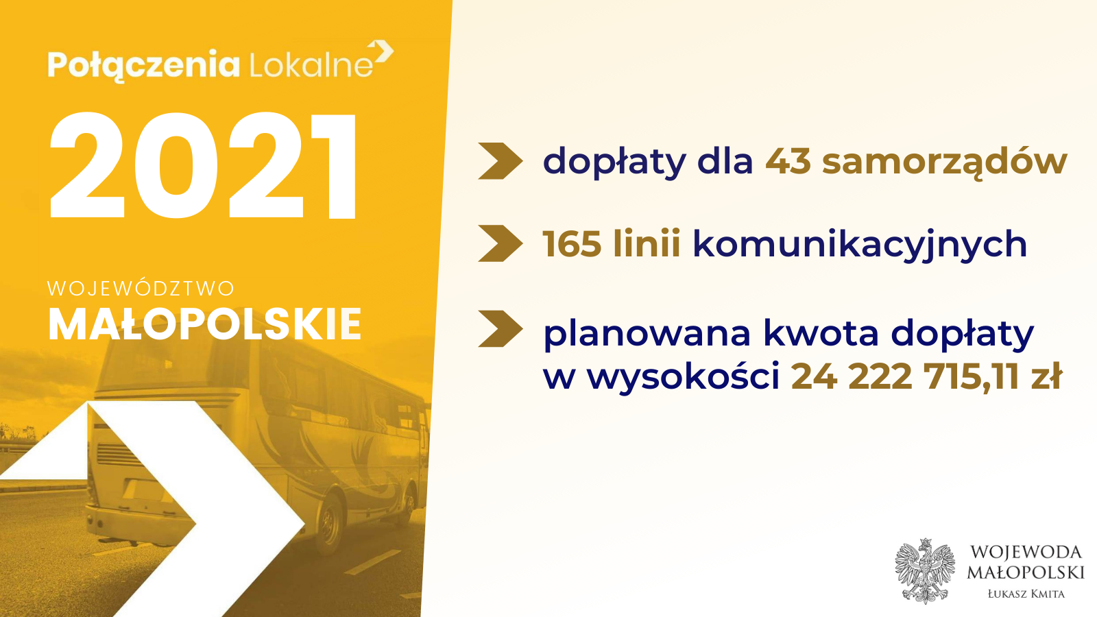 Opiewają one na kwotę 24,2 mln złotych, która umożliwi utrzymanie i uruchomienie 165 linii komunikacyjnych. Z naboru, który zakończył się 24 listopada, skorzystało 43 organizatorów przewozów autobusowych o charakterze użyteczności publicznej. Największe dofinansowanie otrzymają: województwo małopolskie (blisko 9,5 mln zł), miasto i gmina Wieliczka (ponad 1,6 mln zł) oraz powiat tatrzański (blisko 1,6 mln zł). Na rok 2021 dla Małopolski została zaplanowana kwota 41,5 mln zł.