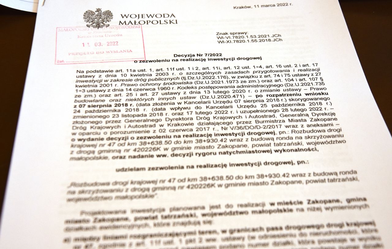 Wojewoda małopolski Łukasz Kmita zatwierdził projekt budowlany i wydał decyzję o zezwoleniu na realizację inwestycji drogowej (tzw. „zrid”) dla rozbudowy drogi krajowej nr 47 wraz z budową ronda na skrzyżowaniu z drogą gminną nr 420226K w Zakopanem. Decyzji nadano rygor natychmiastowej wykonalności.