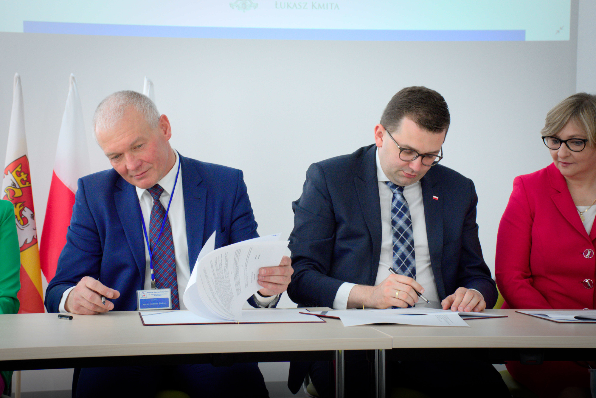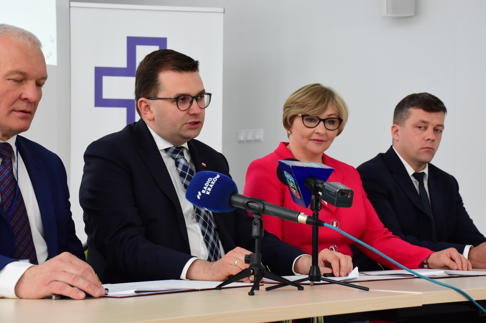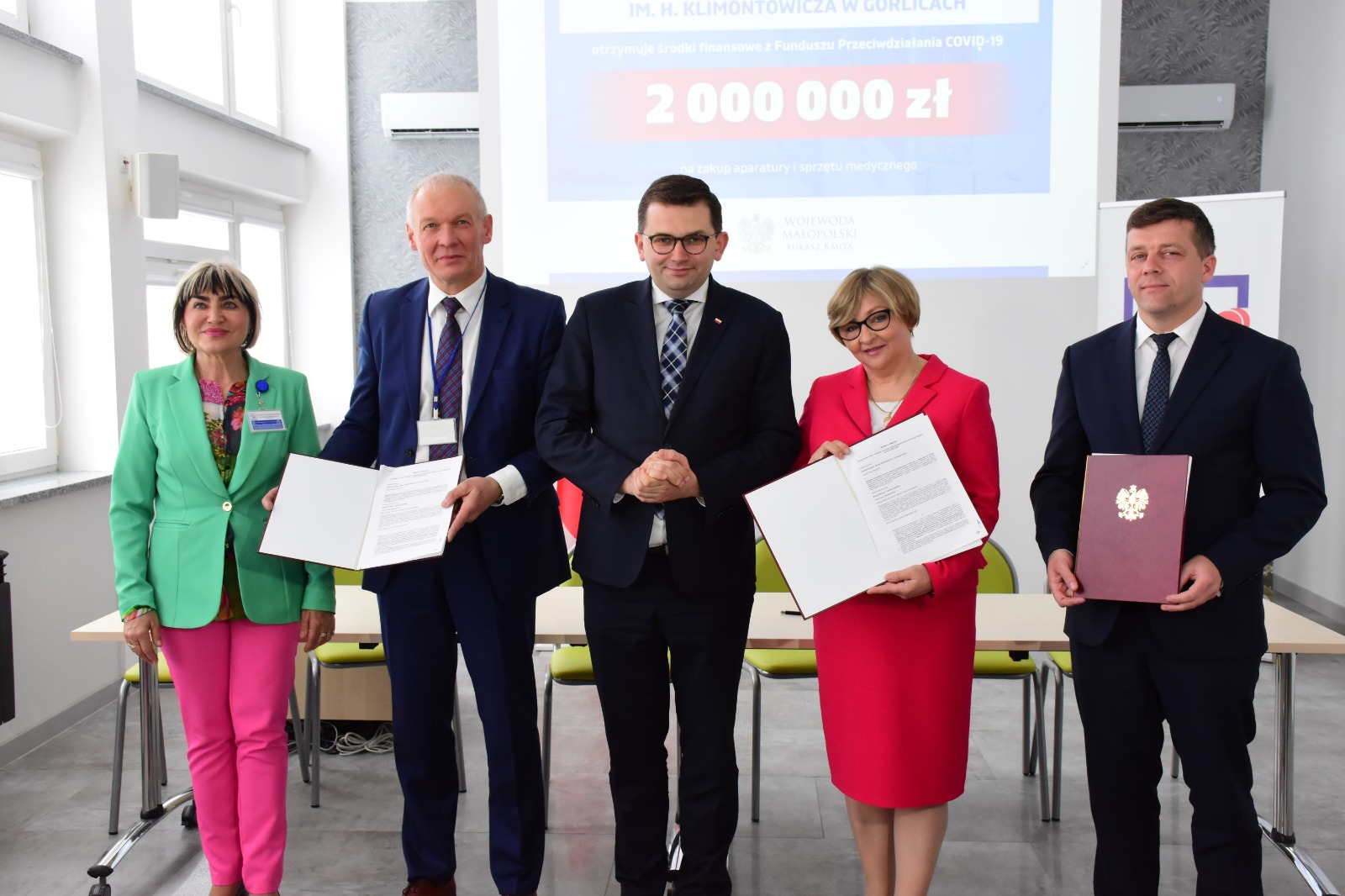 Dzisiaj wojewoda małopolski Łukasz Kmita podpisał z dyrektorem Szpitala Marianem Świerzem umowę potwierdzającą przyznanie placówce w 2022 roku 2 mln zł z Funduszu Przeciwdziałania COVID-19 na zakup aparatury i sprzętu medycznego. W wydarzeniu uczestniczyli: poseł Barbara Bartuś, senator Wiktor Durlak oraz zastępca dyrektora Szpitala ds. medycznych Jolanta Malinowska-Pietrachowicz.