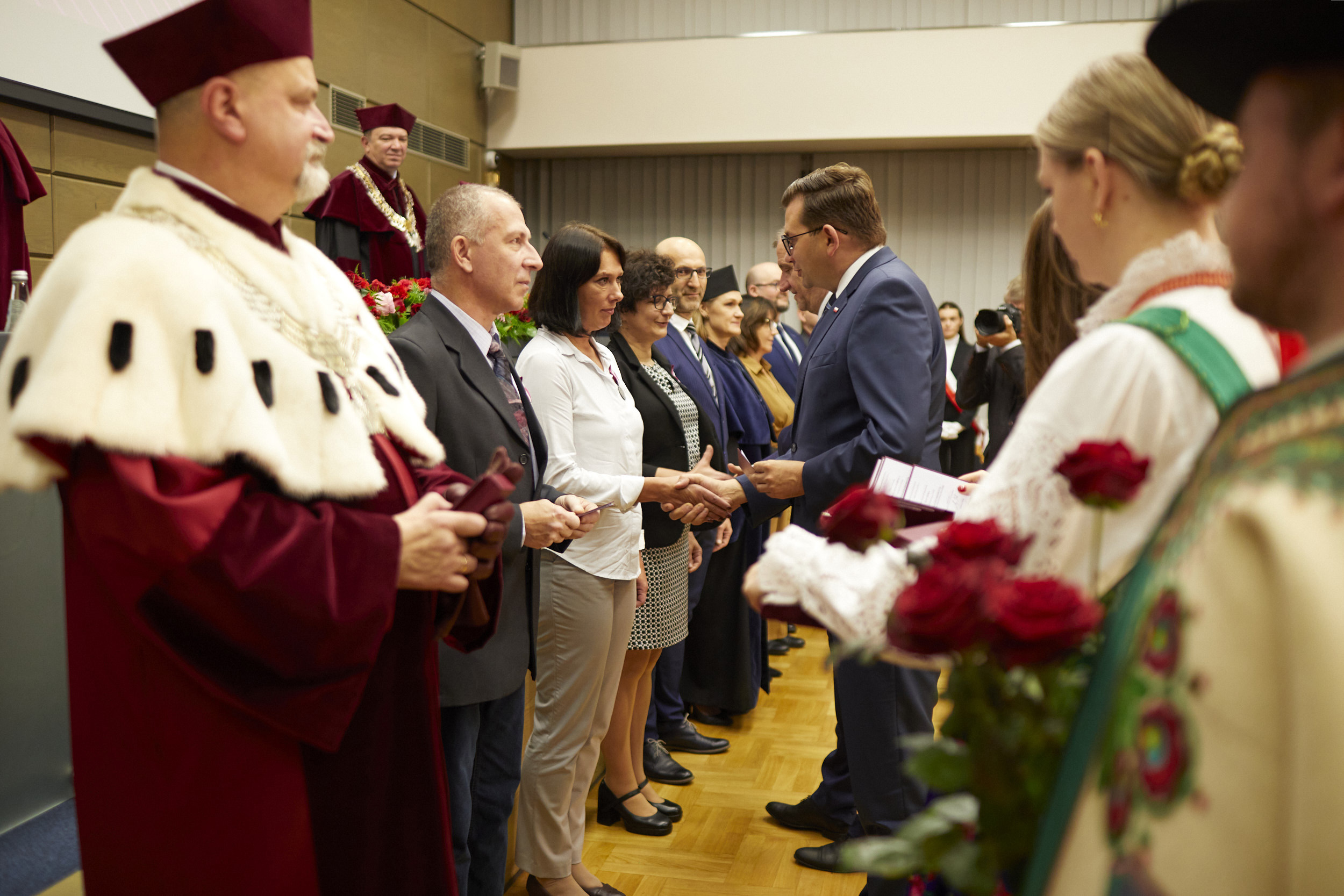- „Zasoby i oferta Uczelni są w szczególności ukierunkowane na rozwiązywanie problemów szeroko pojętego sektora agrobiznesu i obszarów wiejskich, co znajduje swoje odzwierciedlenie w haśle Z natURy najlepsi”. Tak jeden ze swych celów strategicznych Uniwersytet Rolniczy sformułował w „Strategii na lata 2021-2025”. Życzę sukcesów w realizacji tych zamierzeń. Niech uczelnia rośnie w siłę, kształcąc kolejne pokolenia specjalistów. Blisko 8 tys. studentów i 1,5 tys. pracowników – to wielka społeczność. Serdecznie dziękuję Magnificencji – Prof. Sylwestrowi Taborowi – za dbałość o jej rozwój i pomyślność, za służbę nauce i dydaktyce. Złoty Medal przyznany przez Pana Prezydenta jest najlepszym potwierdzeniem tych zasług – mówi wojewoda małopolski Łukasz Kmita.
