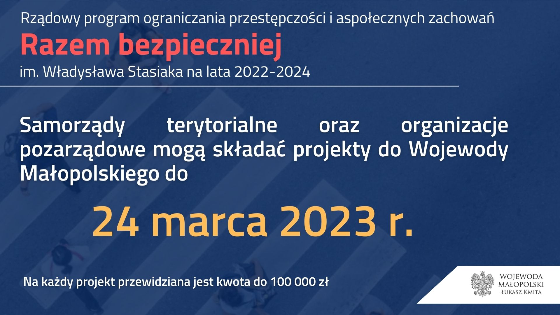 Trwa nabór wniosków na dofinansowanie z Rządowego programu ograniczania przestępczości i aspołecznych zachowań „Razem bezpieczniej im. Władysława Stasiaka na lata 2022-2024”. Do 24 marca 2023 roku samorządy terytorialne oraz organizacje pozarządowe mogą składać do Wojewody Małopolskiego projekty, których celem jest podnoszenie bezpieczeństwa w lokalnych społecznościach.