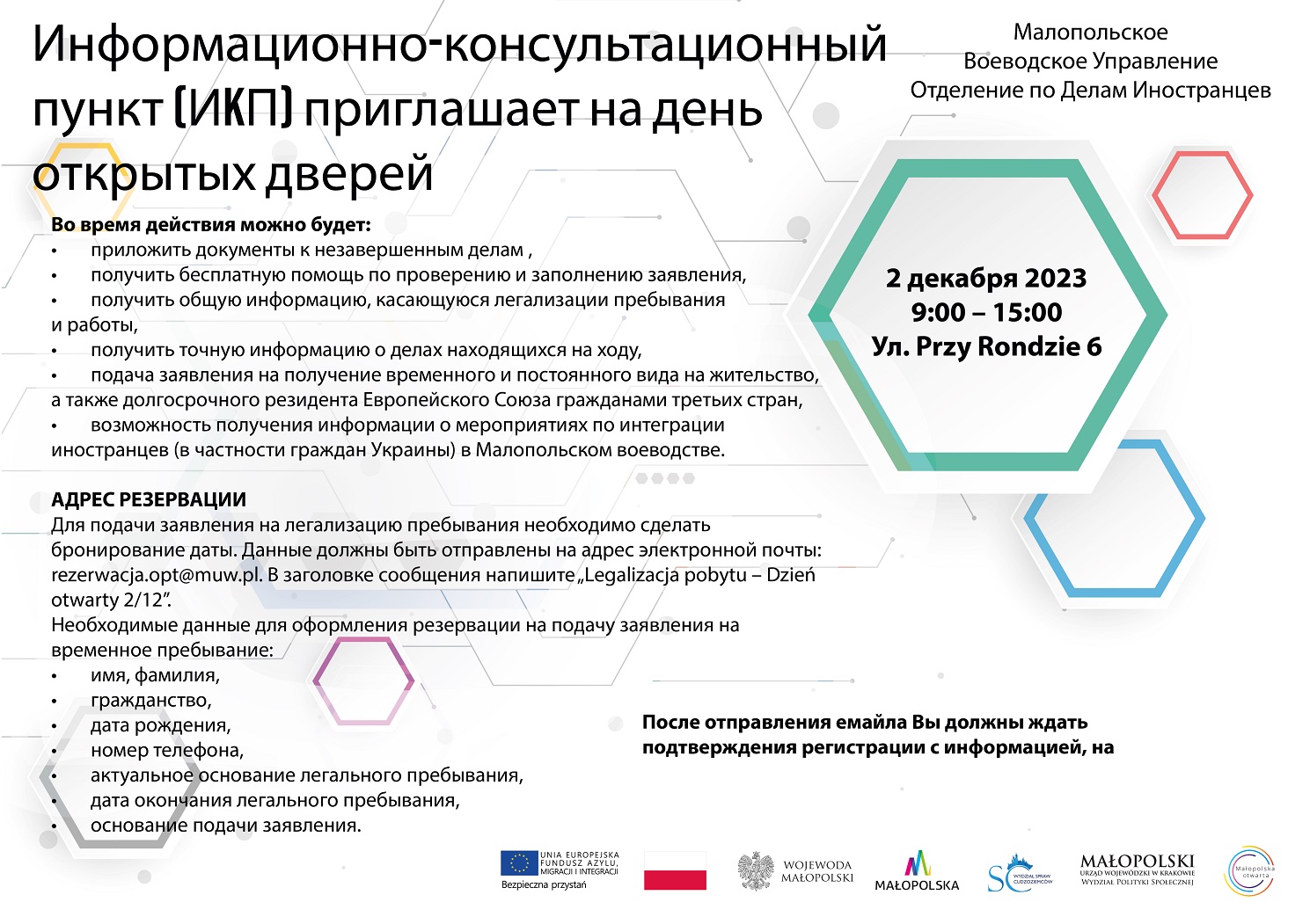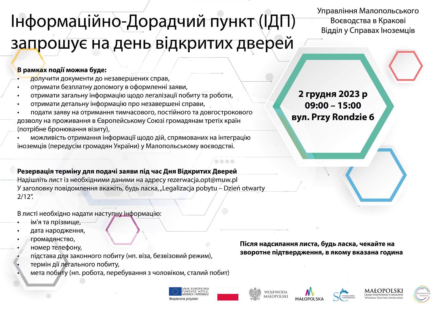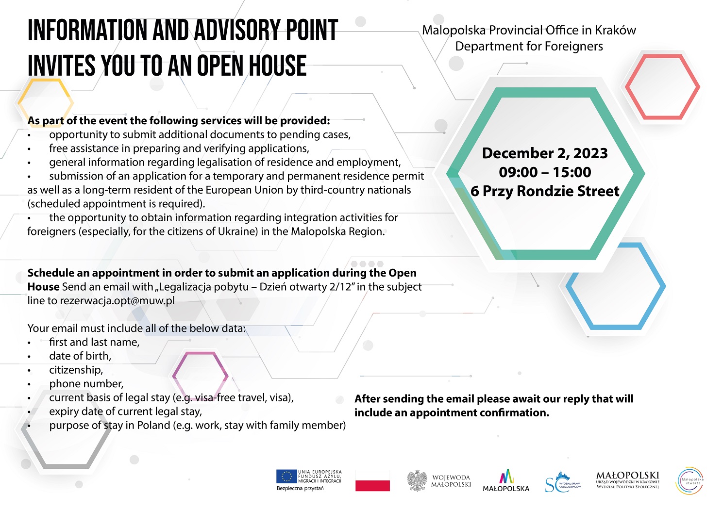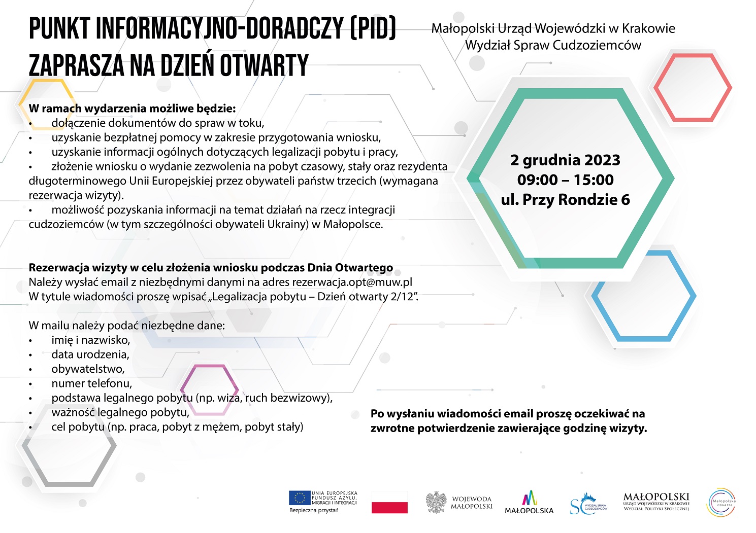 W sobotę 2 grudnia 2023 r., w godzinach od 9:00 do 15:00, w siedzibie Wydziału Spraw Cudzoziemców Małopolskiego Urzędu Wojewódzkiego w Krakowie (ul. Przy Rondzie 6) odbędzie się trzydziesty drugi w tym roku, „Dzień otwarty Punktu Informacyjno-Doradczego (PID)”.