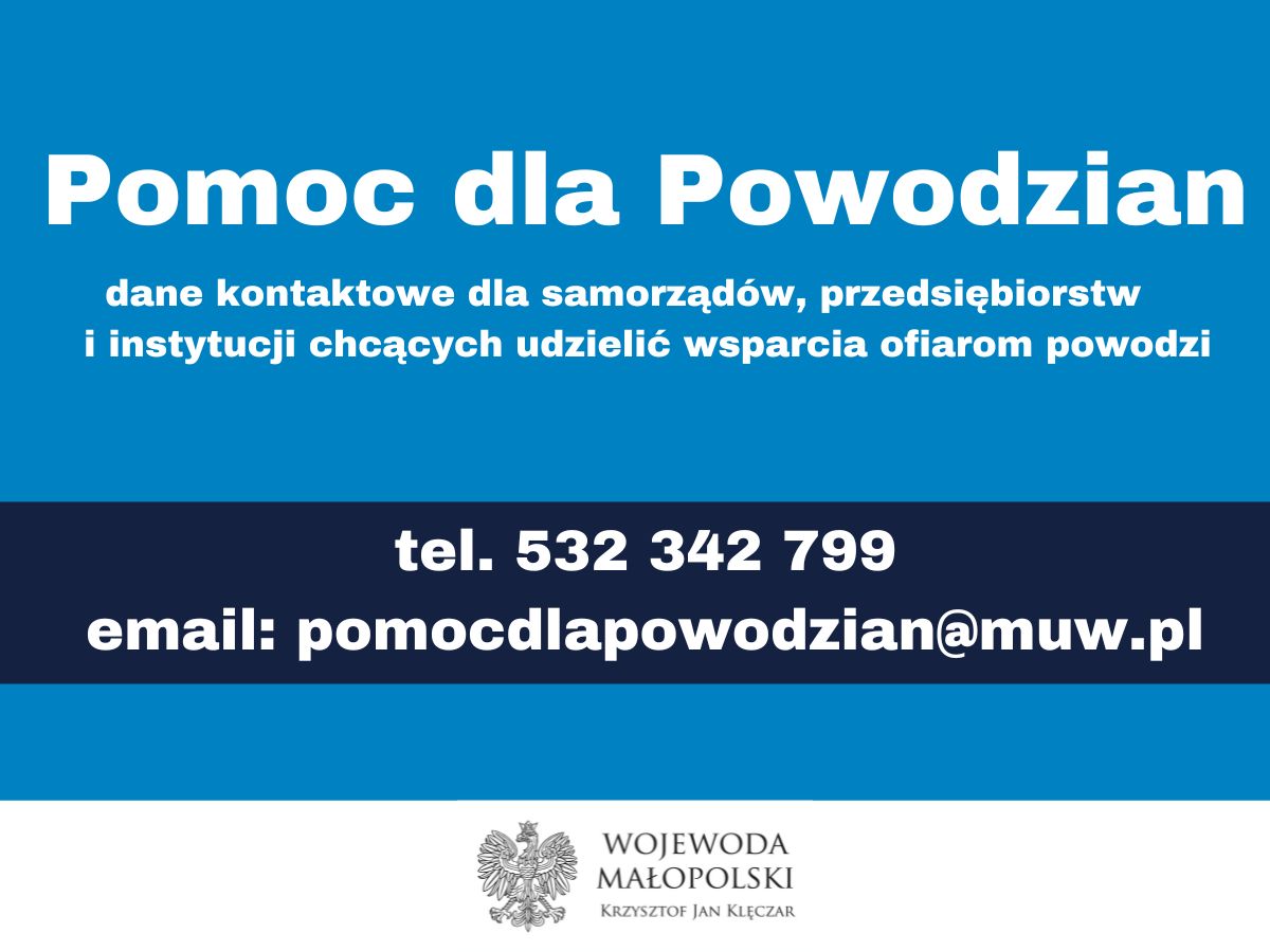 Wojewoda Małopolski koordynuje pomoc od osób prawnych dla poszkodowanych w powodzi. Przedsiębiorcy i jednostki samorządu terytorialnego chcące udzielić wsparcia materialnego bądź finansowego mogą zgłaszać się do koordynatorki wojewódzkiej Pauliny Dziób (tel.: 532 342 799) lub na adres mailowy: pomocdlapowodzian@muw.pl.