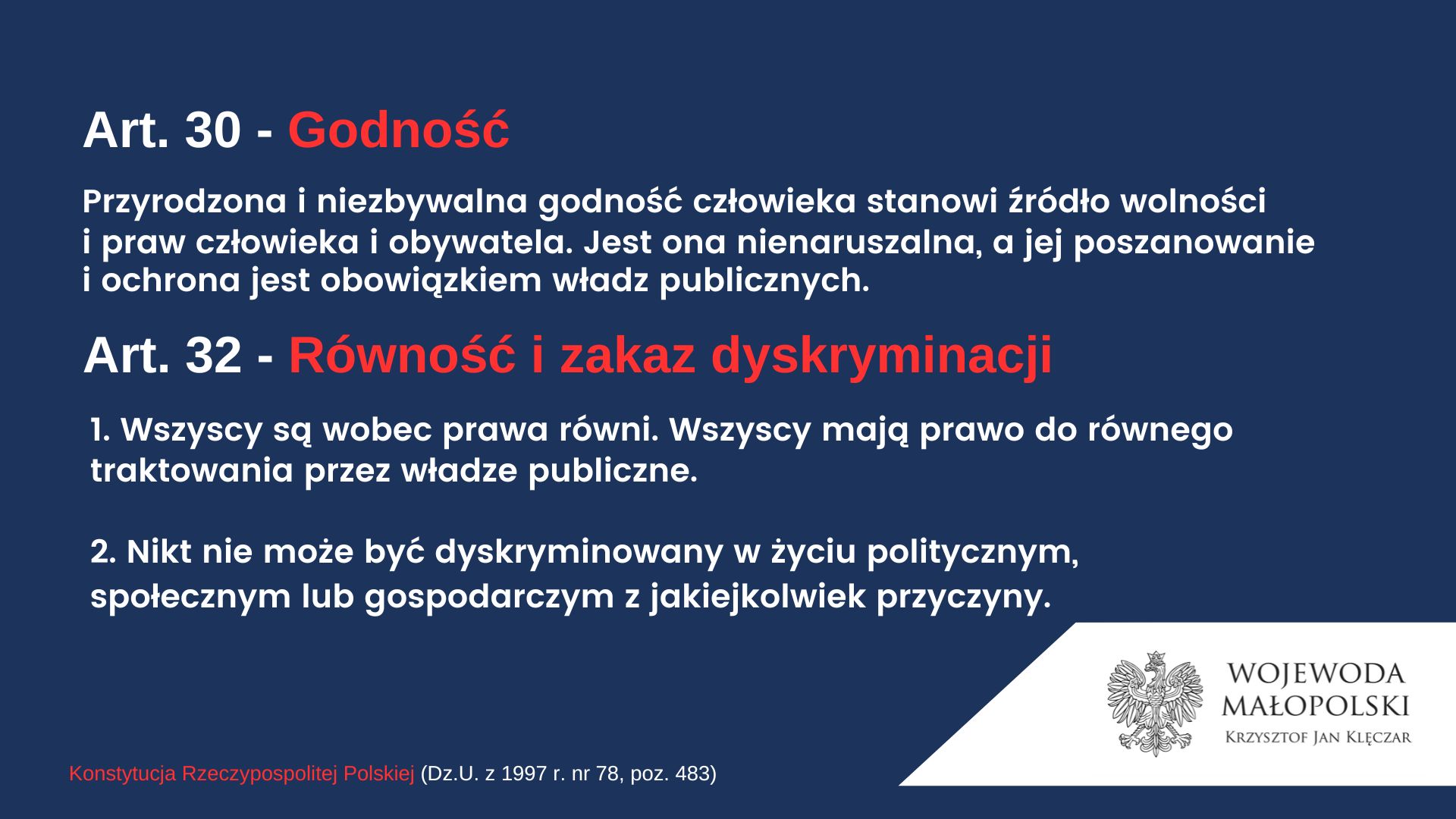 - Wszyscy mają prawo do równego traktowania przez władze publiczne. Nikt nie może być dyskryminowany w życiu politycznym, społecznym lub gospodarczym z jakiejkolwiek przyczyny. Godność człowieka jest niezbywalna i nienaruszalna, a jej ochrona stanowi obowiązek władz publicznych. To są zapisy zawarte w Konstytucji Rzeczypospolitej Polskiej. Dlatego nie ma mojej zgody na wypowiedzi dyskryminujące i obrażające część społeczeństwa. Wolność wyrażania poglądów nie oznacza, że można kogoś dowolnie piętnować, upokarzać czy naruszać jego godność. Jeżeli Rada Powiatu Nowotarskiego nie podjęłaby działań w swoim zakresie, gotowy byłem stwierdzić nieważność wydanej przez ten organ rezolucji – mówi wojewoda małopolski Krzysztof Jan Klęczar.