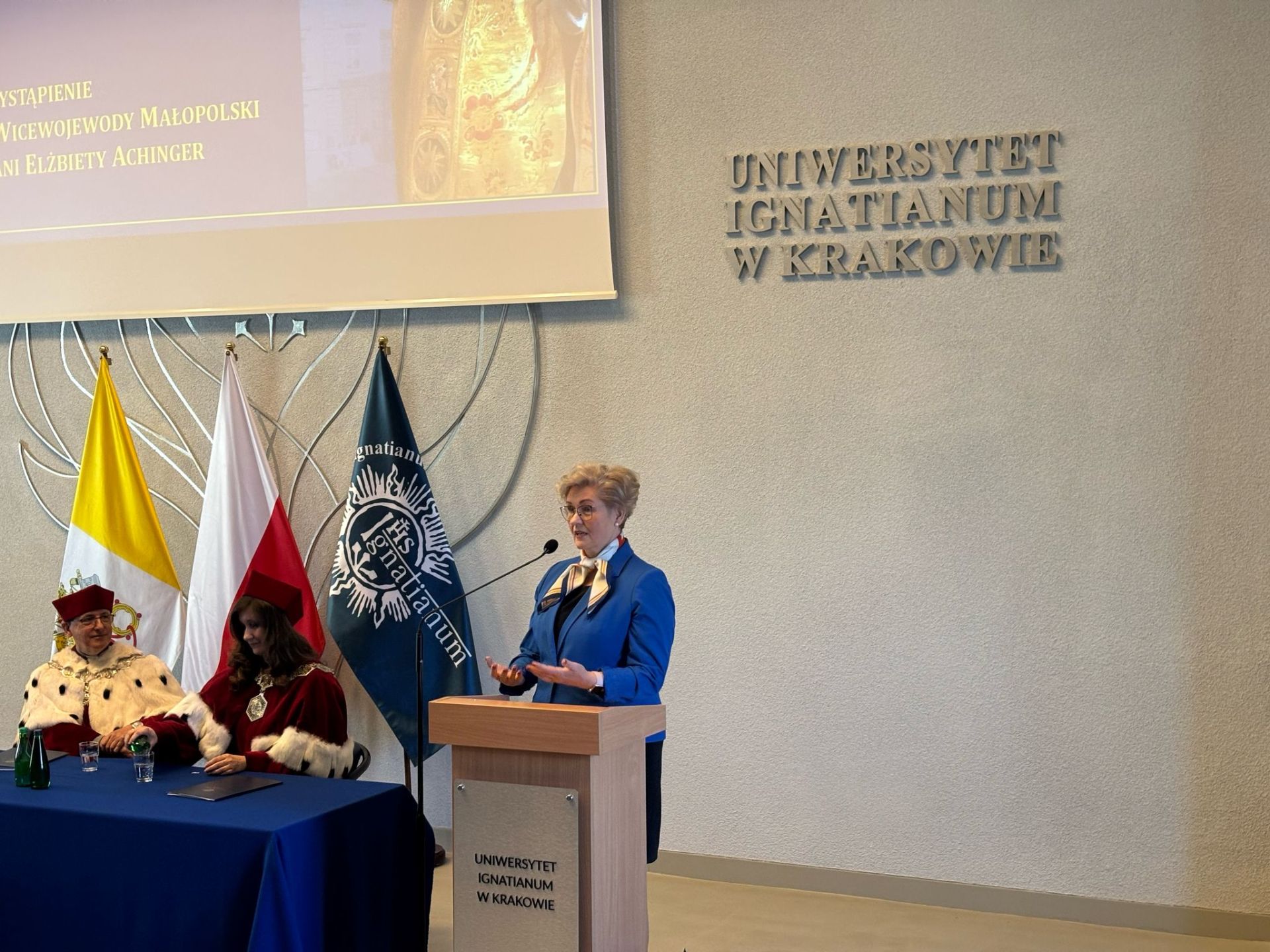- Uniwersytety to miejsca, w których nauka i rozwój intelektualny odgrywają kluczową rolę w kształtowaniu przyszłości kolejnych pokoleń. To przestrzeń wymiany myśli i idei, w której studenci zdobywają wiedzę oraz umiejętności potrzebne do aktywnego uczestnictwa w życiu społecznym. Składam całej społeczności Uniwersytetu Ignatianum serdecznie gratulacje i życzę samych sukcesów – mówi I wicewojewoda małopolska Elżbieta Achinger.