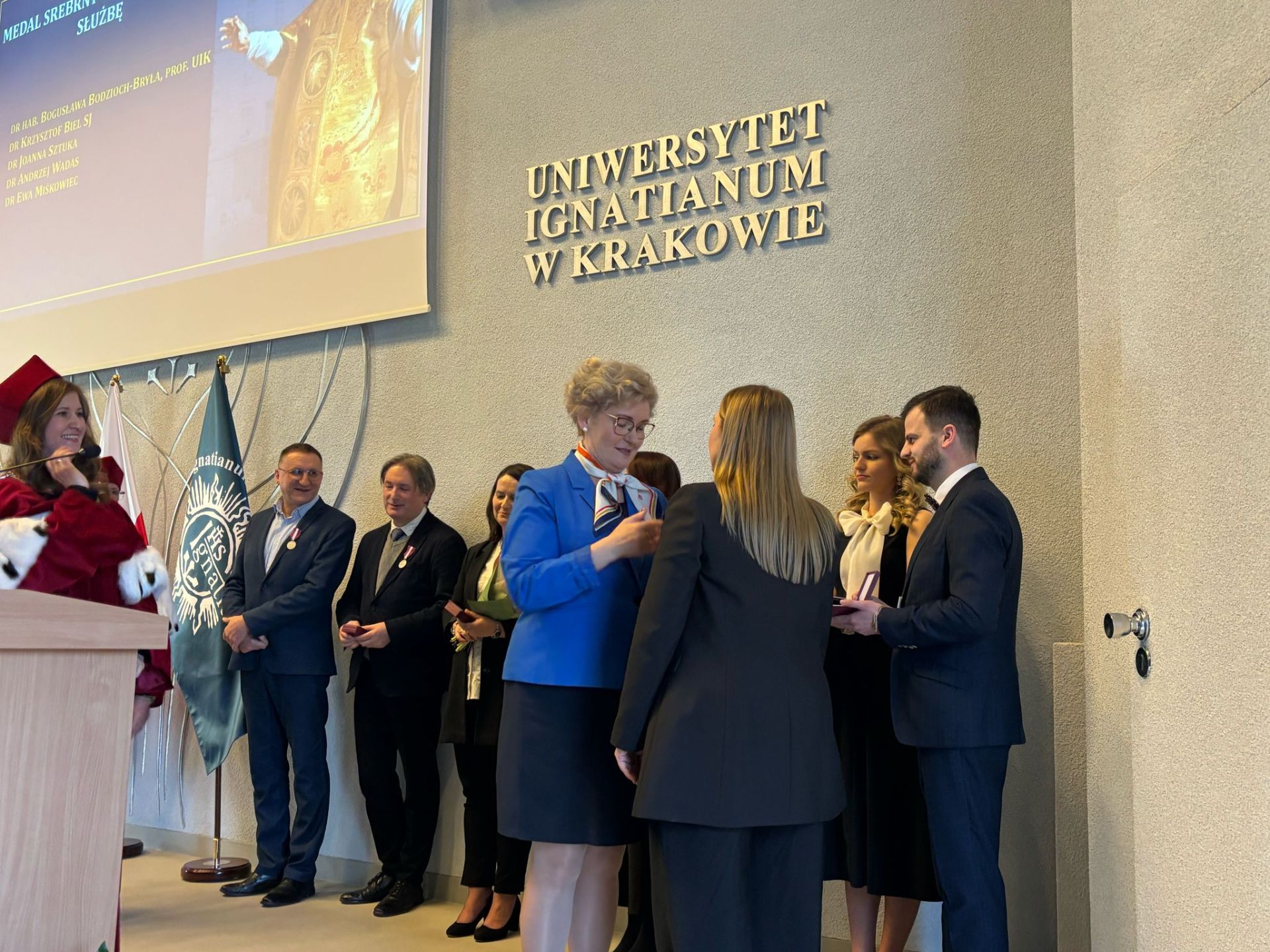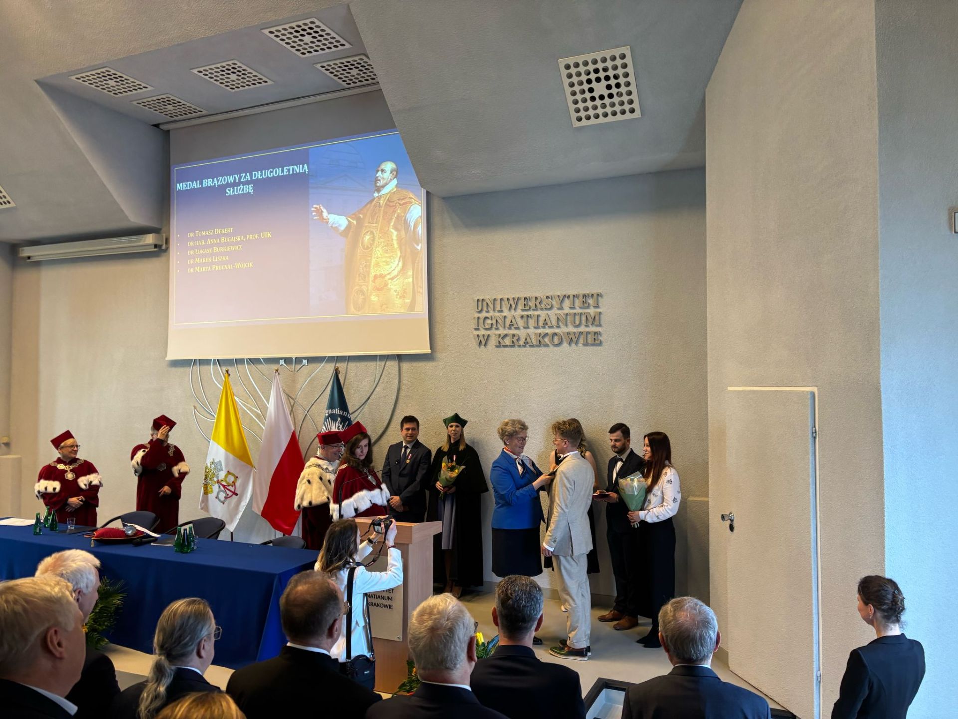Za wzorowe, wyjątkowo sumienne wykonywanie obowiązków wynikających z pracy zawodowej prezydent Rzeczypospolitej Polskiej Andrzej Duda przyznał pracownikom Uniwersytetu Ignatianum w Krakowie 5 Złotych, 5 Srebrnych i 5 Brązowych Medali za Długoletnią Służbę. Uroczystej dekoracji dokonała I wicewojewoda małopolska Elżbieta Achinger.
