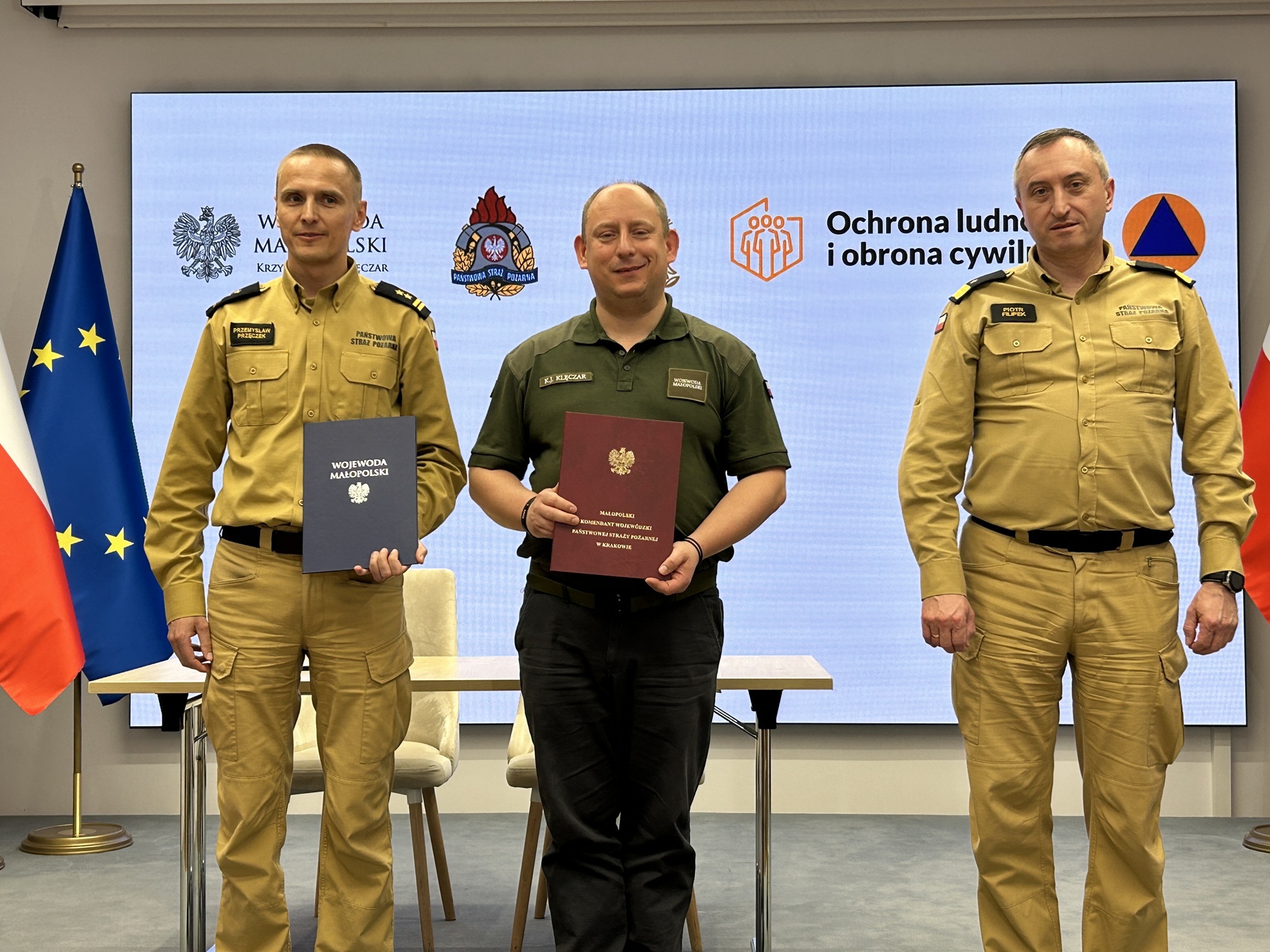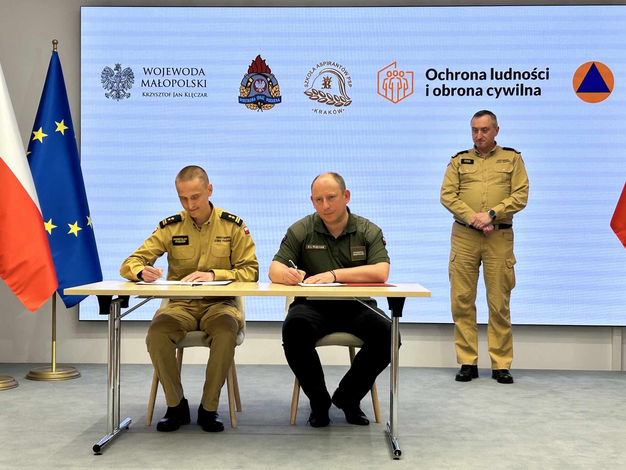Wojewoda małopolski Krzysztof Jan Klęczar podpisał dziś z małopolskim komendantem wojewódzkim Państwowej Straży Pożarnej w Krakowie bryg. Przemysławem Przęczkiem porozumienie w sprawie współpracy w przeprowadzeniu szkolenia zasadniczego z zakresu ochrony ludności i obrony cywilnej dla wójtów, burmistrzów i prezydentów miast. W wydarzeniu uczestniczył komendant Szkoły Aspirantów PSP w Krakowie nadbryg. Piotr Filipek.