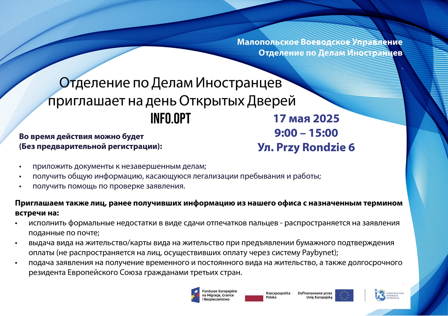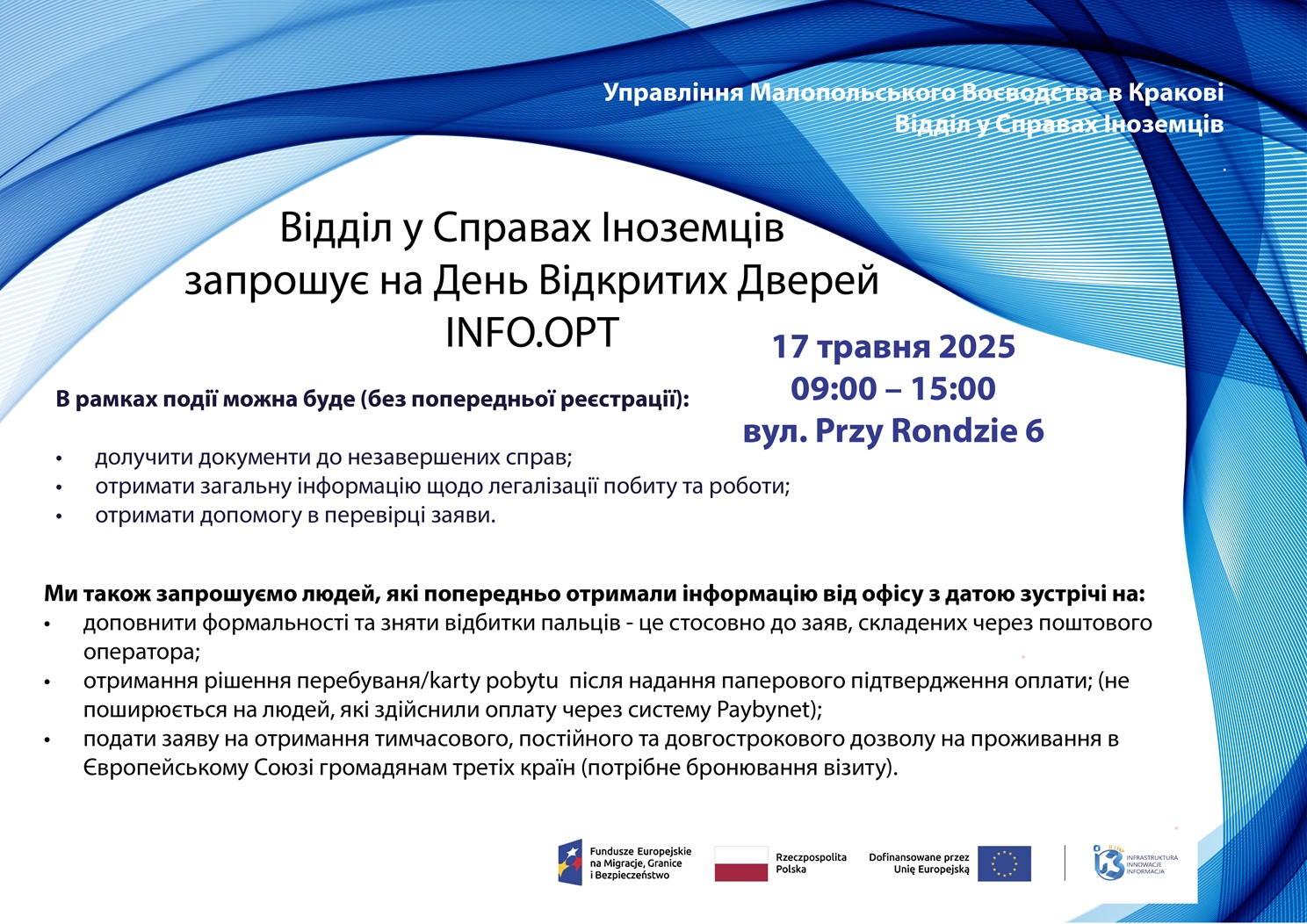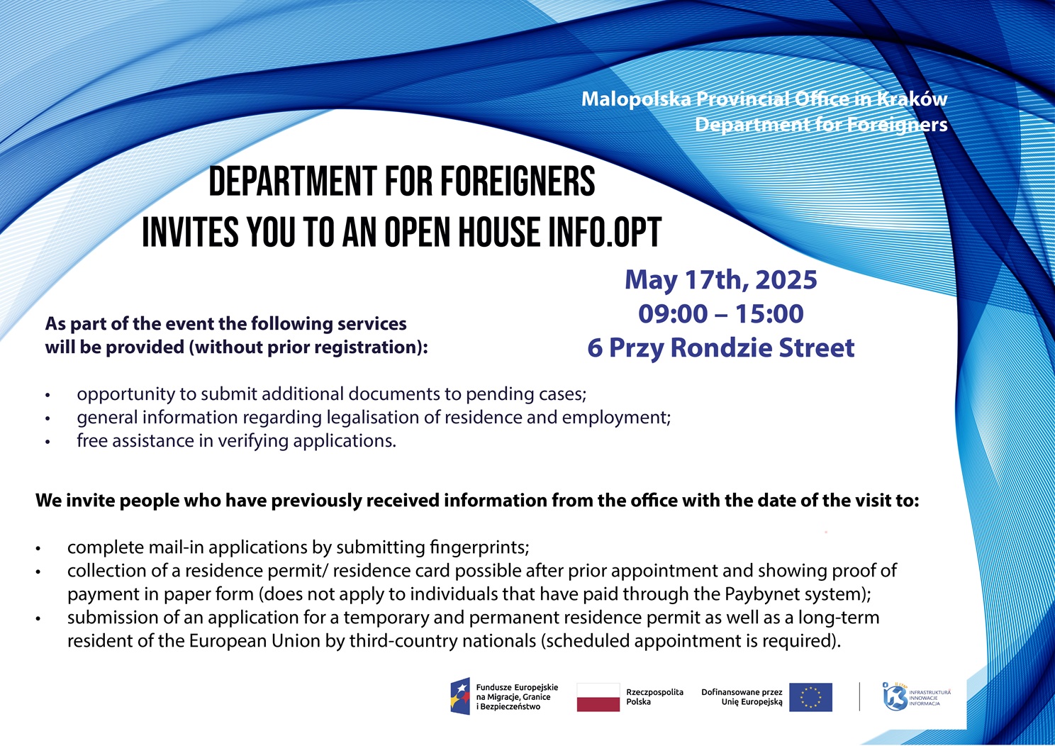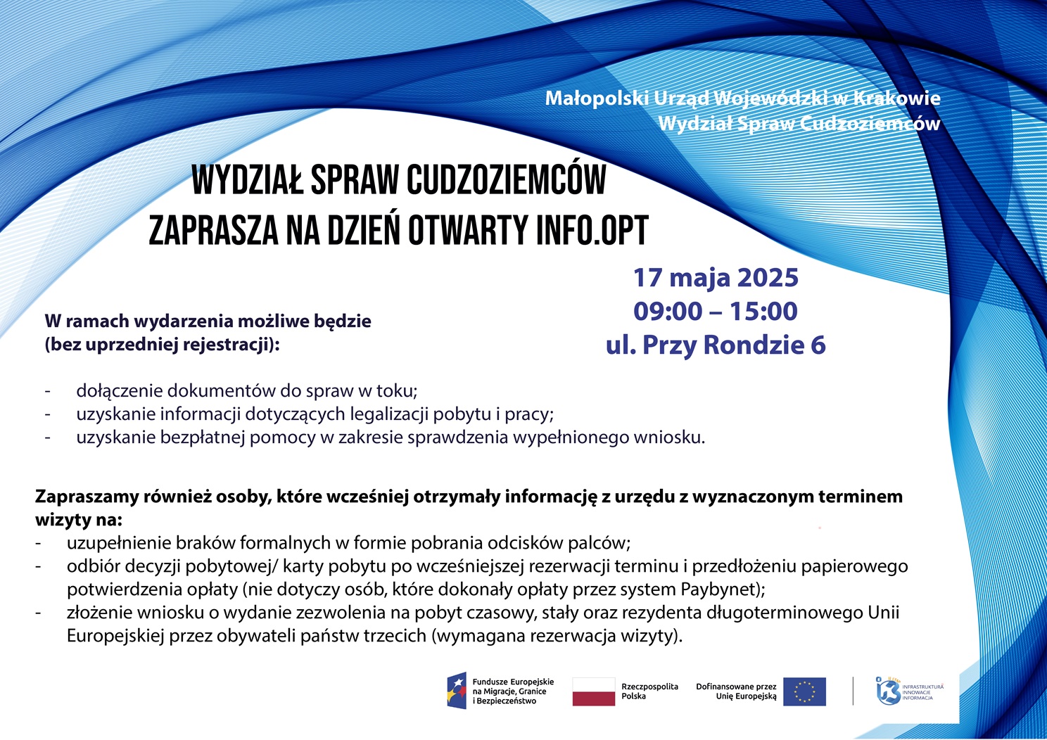 Wydział Spraw Cudzoziemców Małopolskiego Urzędu Wojewódzkiego w Krakowie zaprasza na „Dzień otwarty INFO.OPT”. Wydarzenie odbędzie się w sobotę 17 maja 2025 r., w godzinach od 9:00 do 15:00, w siedzibie Wydziału (Kraków, ul. Przy Rondzie 6).