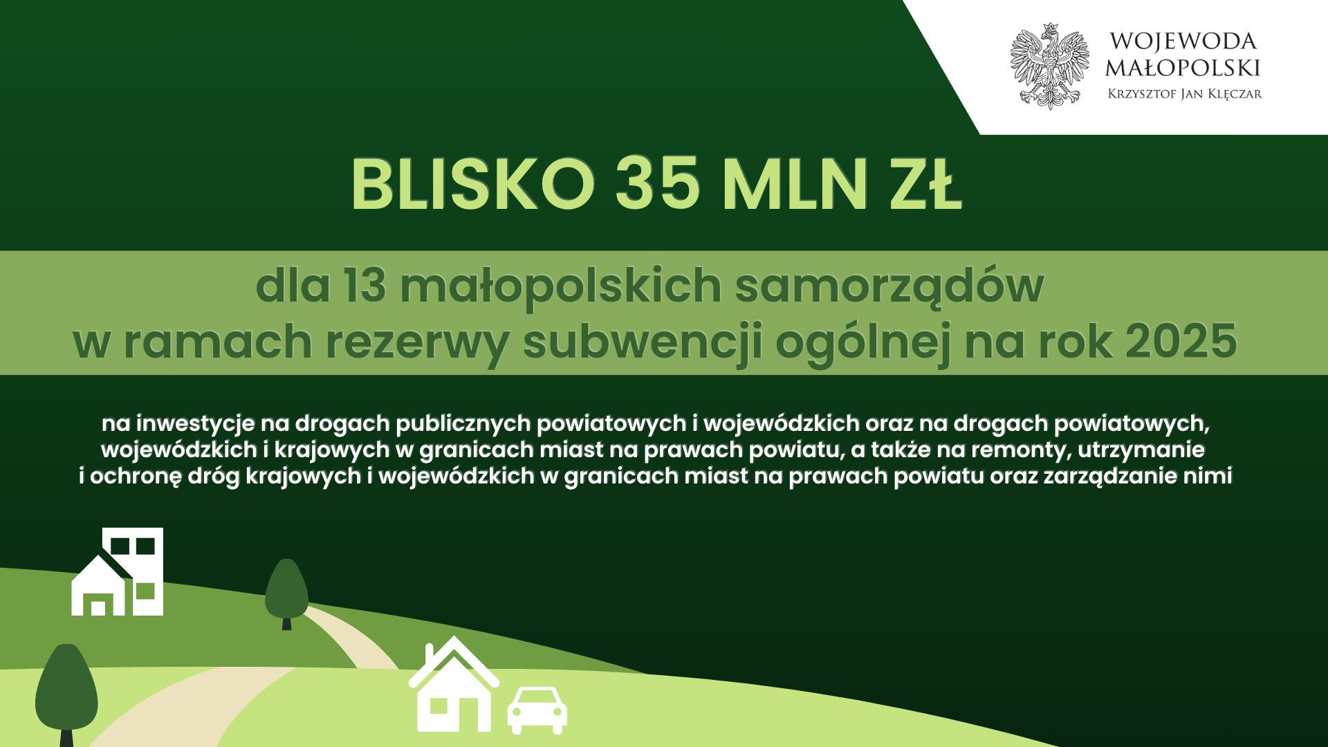 - 13 małopolskim jednostkom samorządu terytorialnego przyznano środki w wysokości prawie 35 mln zł na dofinasowanie zadań drogowych ze środków rezerwy subwencji ogólnej na rok 2025. Uruchomione przez rząd środki są przeznaczone na inwestycje na drogach publicznych powiatowych i wojewódzkich oraz na drogach powiatowych, wojewódzkich i krajowych w granicach miast na prawach powiatu, a także na remonty, utrzymanie i ochronę dróg krajowych i wojewódzkich w granicach miast na prawach powiatu oraz zarządzanie nimi. Wykonanie tych zadań wpłynie bezpośrednio na poprawę bezpieczeństwa kierowców i wszystkich uczestników ruchu drogowego. Jest to także szerszy element walki z wykluczeniem komunikacyjnym – mówi wojewoda małopolski Krzysztof Jan Klęczar.