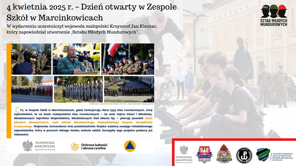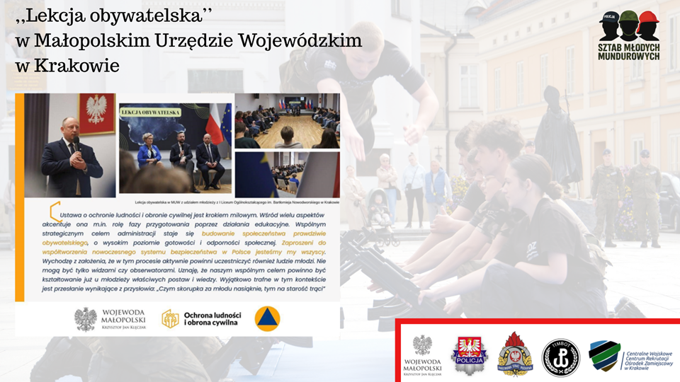 - Pilotażowy projekt Sztab Młodych Mundurowych to doskonała okazja do pogłębienia współpracy Policji, Straży Pożarnej i Wojska. Wspólne działania służb pokazują, jak kluczową kwestią jest bezpieczeństwo i wiedza z zakresu ochrony ludności cywilnej. Zdobycie doświadczenia, praktyki i wiedzy , a także kształtowanie gotowości do służby i postaw patriotycznych to główne umiejętności, które posiądzie młodzież. Łącznie na terenie województwa małopolskiego w klasach wojskowych uczy się około 1900 kadetów w Oddziałach Przygotowania Wojskowego, Branżowych Oddziałach Wojskowych i CYBER.MIL z KLASĄ. Tworzą oni przyszłą kadrę Wojska Polskiego, bo zdecydowana większość z nich wstępuje w szeregi armii – mówi cz. p.o. zastępca szefa Ośrodka Zamiejscowego w Krakowie Centralnego Wojskowego Centrum Rekrutacji w Krakowie ppłk Mariusz Błaszczyk.