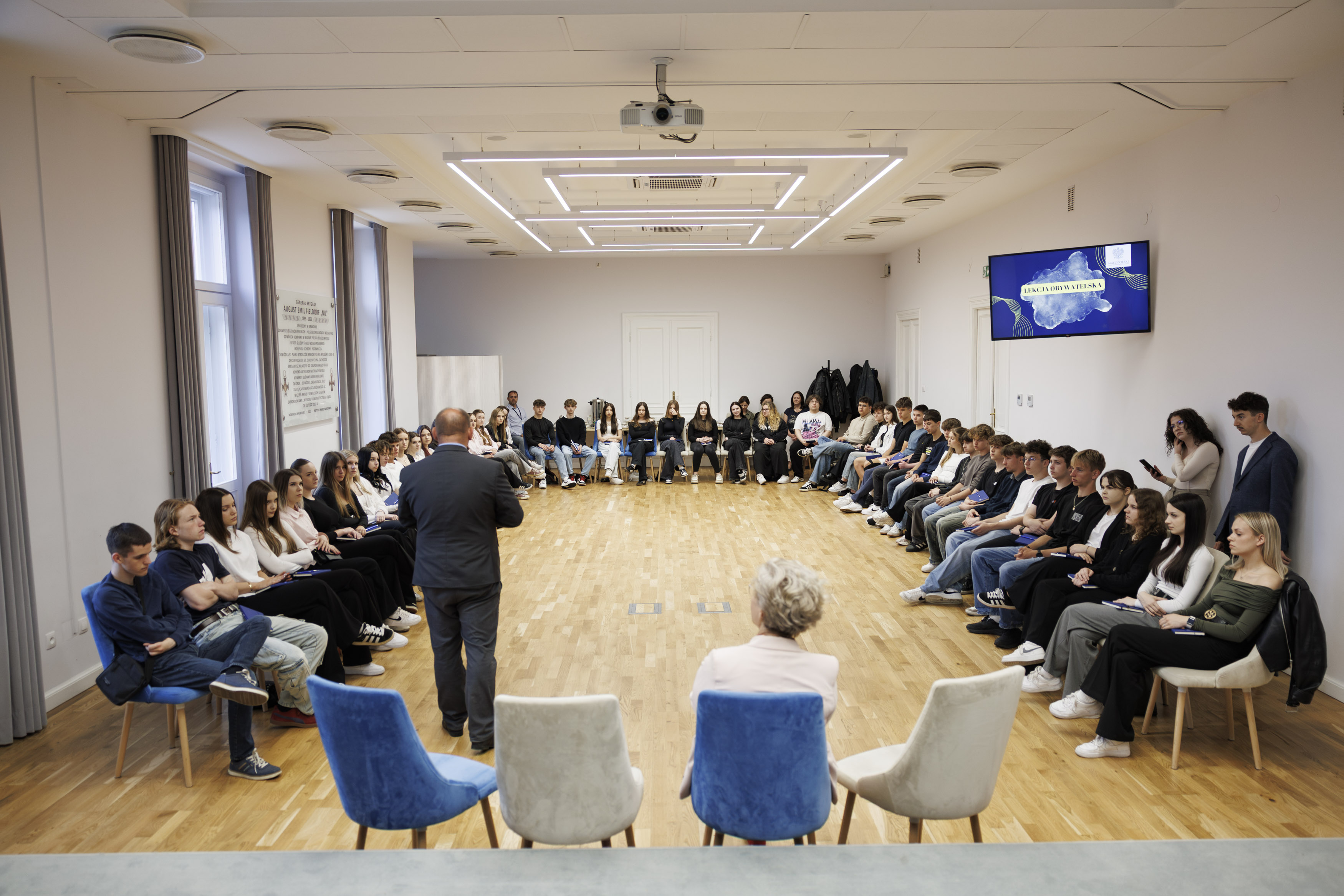 Podczas spotkania uczniowie zadawali pytania dotyczące m.in. funkcjonowania Małopolskiego Urzędu Wojewódzkiego w Krakowie, roli wojewody, a także tematów związanych z obywatelstwem i wpływem młodych ludzi na decyzje podejmowane lokalnie i ogólnokrajowo.