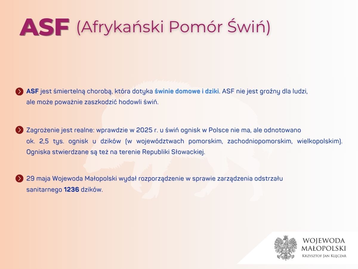 29 maja 2025 r. Wojewoda Małopolski wydał rozporządzenie w sprawie zarządzenia odstrzału sanitarnego 1236 dzików na obszarze zagrożenia wystąpieniem afrykańskiego pomoru świń na terenie powiatów: dąbrowskiego, gorlickiego, krakowskiego, Miasta Krakowa, miechowskiego, nowosądeckiego, Miasta Nowy Sącz, nowotarskiego, olkuskiego, proszowickiego, suskiego, tarnowskiego, wadowickiego oraz wielickiego