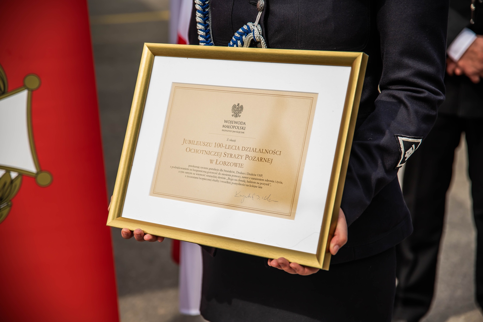 – Przekazuję szczere gratulacje dla Strażaków, Druhen i Druhów OSP, z podziękowaniem za bezgraniczną gotowość do niesienia pomocy, nawet z narażeniem zdrowia i życia, a tym samym za wierność strażackiej dewizie „Bogu na chwałę, ludziom na pożytek”, z życzeniami bezpiecznej służby i wszelkiej pomyślności na kolejne lata – przekazał na pamiątkowej ramie wojewoda małopolski Krzysztof Jan Klęczar.