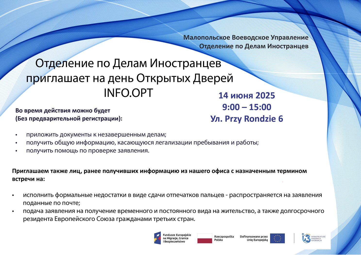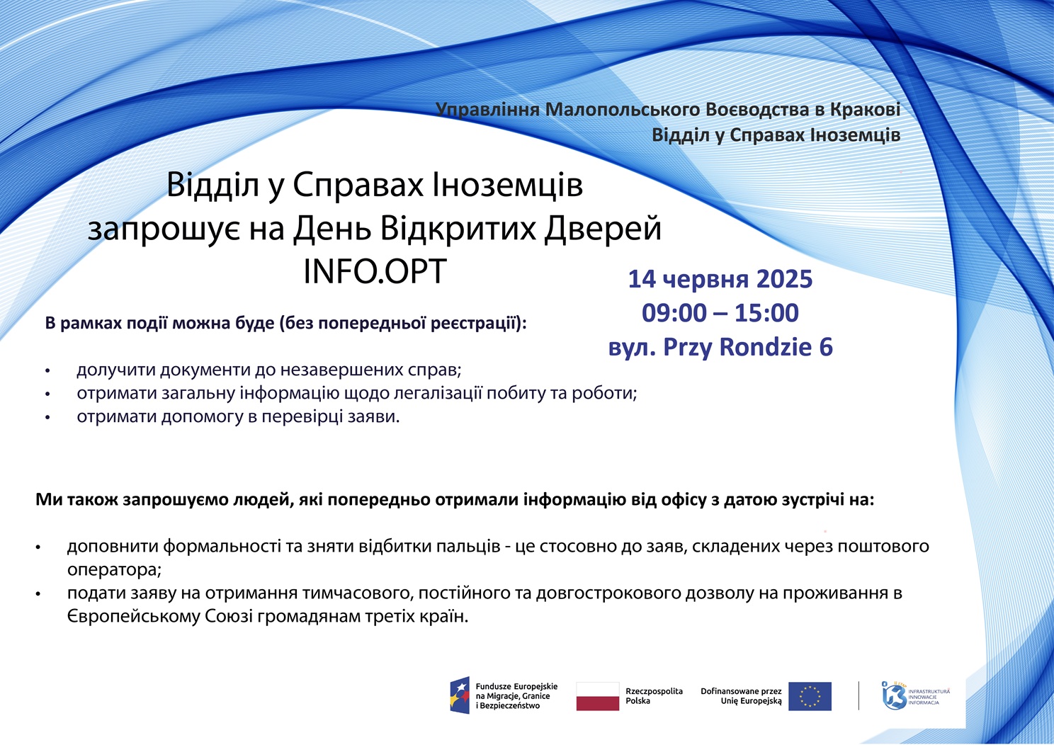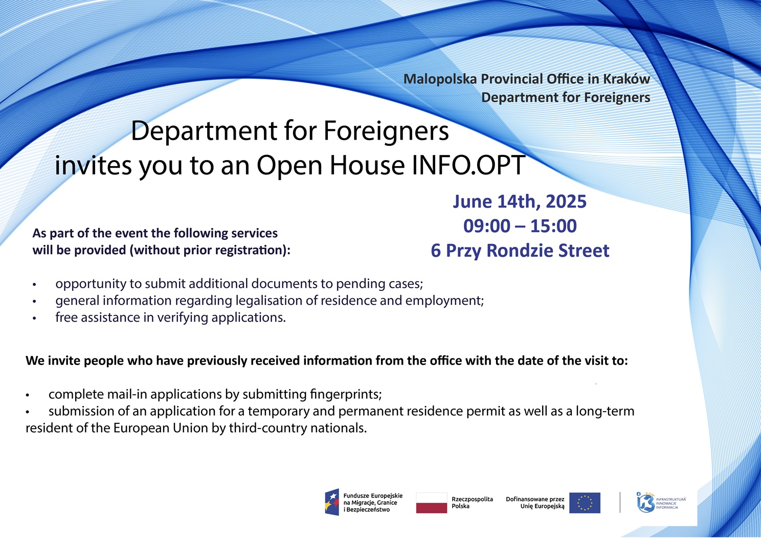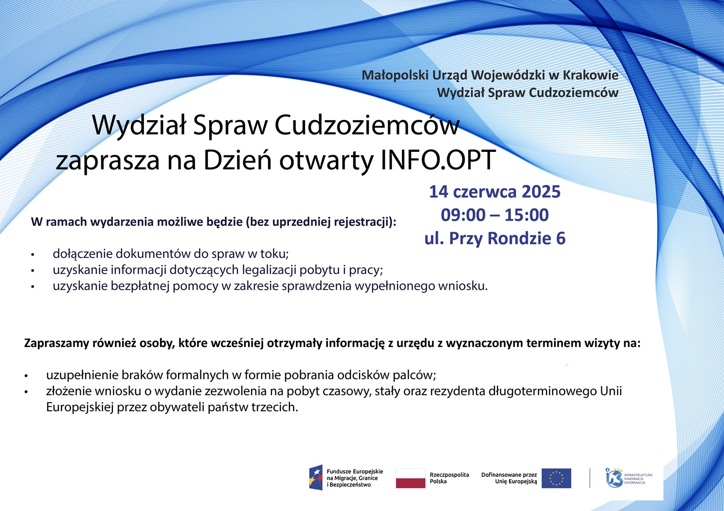 Wydział Spraw Cudzoziemców Małopolskiego Urzędu Wojewódzkiego w Krakowie zaprasza na „Dzień otwarty INFO.OPT”. Wydarzenie odbędzie się w sobotę 14 czerwca 2025 r., w godzinach od 9:00 do 15:00, w siedzibie Wydziału (Kraków, ul. Przy Rondzie 6).