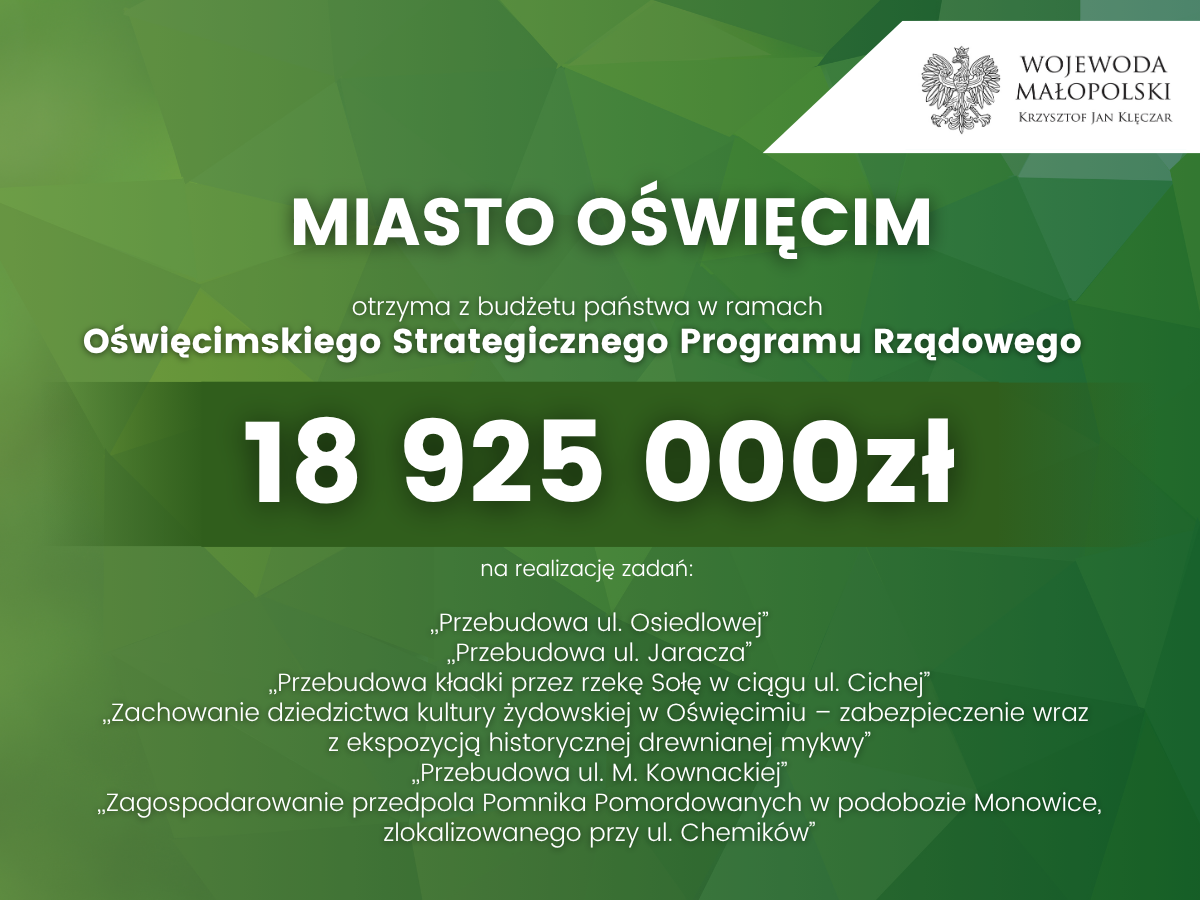 – Wspólnie z wszystkimi beneficjentami przygotowaliśmy projekty, które spotkały się z akceptacją strony rządowej. Nasze starania o przyjęcie kolejnej edycji Oświęcimskiego Strategicznego Programu Rządowego zakończyły się sukcesem. W następnych latach trafią do nas konkretne pieniądze, które zmienią Oświęcim, poprawią wizerunek i funkcjonalność wielu miejsc oraz pozwolą wyeksponować walory turystyczne Starego Miasta. Już teraz zdecydowanie poprawiło się otoczenie Państwowego Muzeum Auschwitz-Birkenau. Mieszkańcy zyskali lepsze warunki życia, podniósł się też standard obsługi osób zwiedzających Miejsce Pamięci – podkreśla Janusz Chwierut, prezydent Oświęcimia.