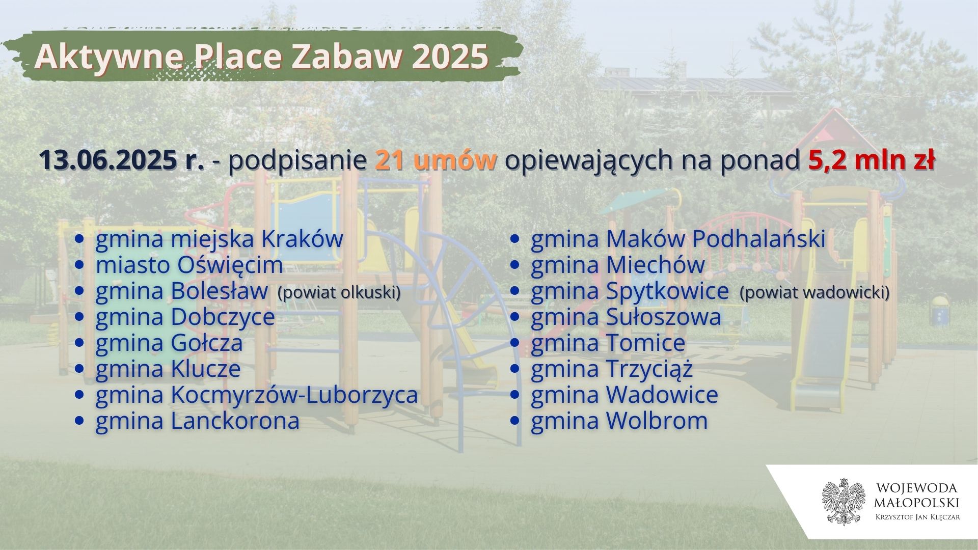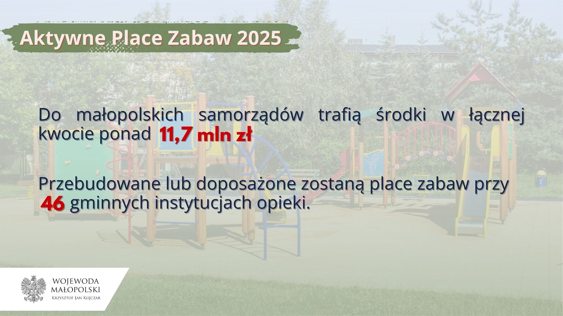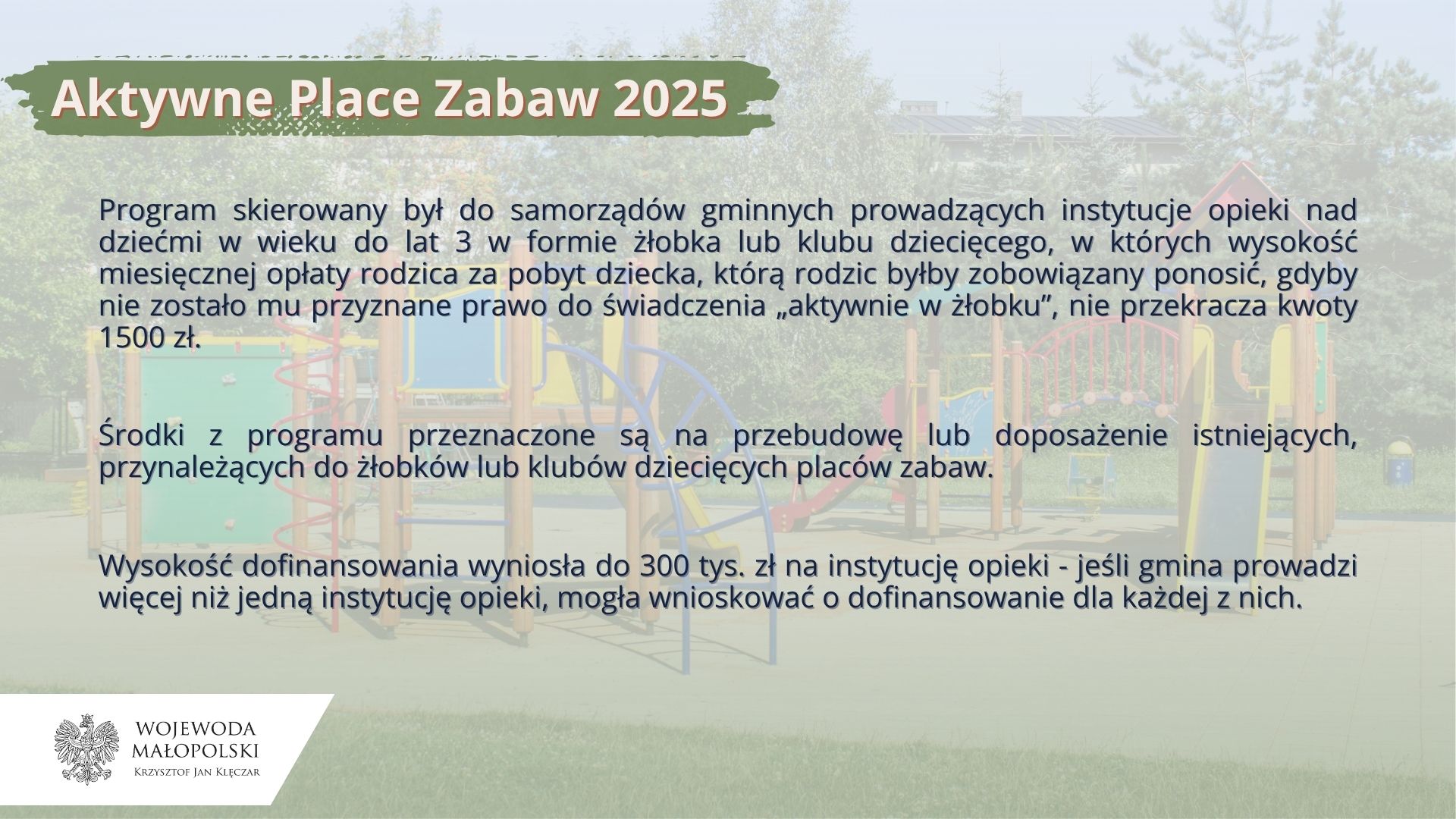 – Po raz kolejny działamy na rzecz opieki nad naszymi najmłodszymi mieszkańcami. Tym razem pomagamy samorządom stworzyć piękne place zabaw. To właśnie w takich miejscach rodzą się pierwsze przyjaźnie, rozwija się kreatywność i sprawność fizyczna. Dzięki programowi „Aktywne Place Zabaw” możemy stworzyć bezpieczne i nowoczesne przestrzenie sprzyjające integracji dzieci. To nie tylko inwestycja w infrastrukturę, ale także inwestycja w zdrowie i przyszłość małych Małopolan – mówi wojewoda małopolski Krzysztof Jan Klęczar.