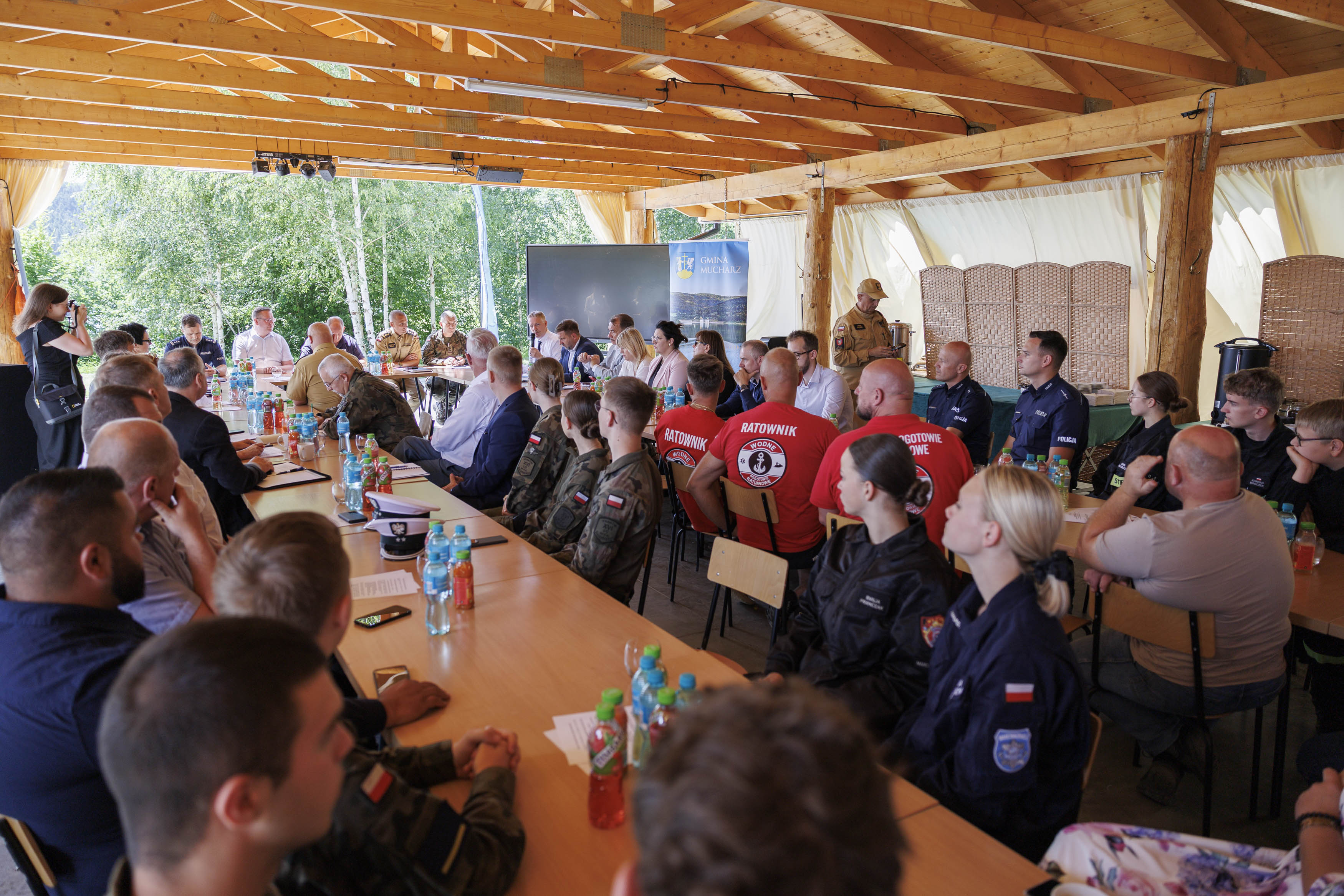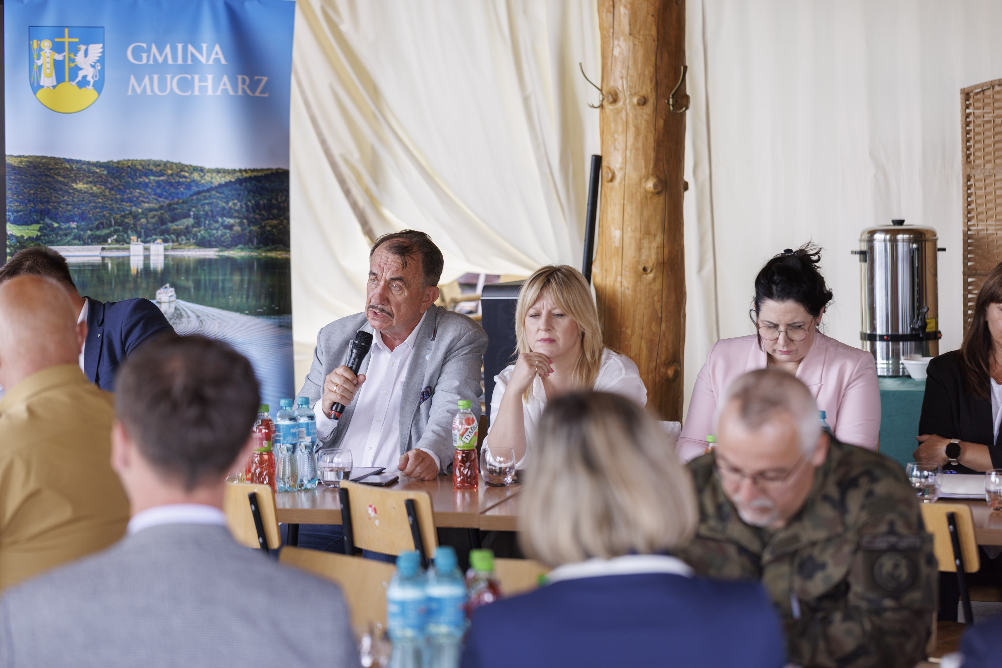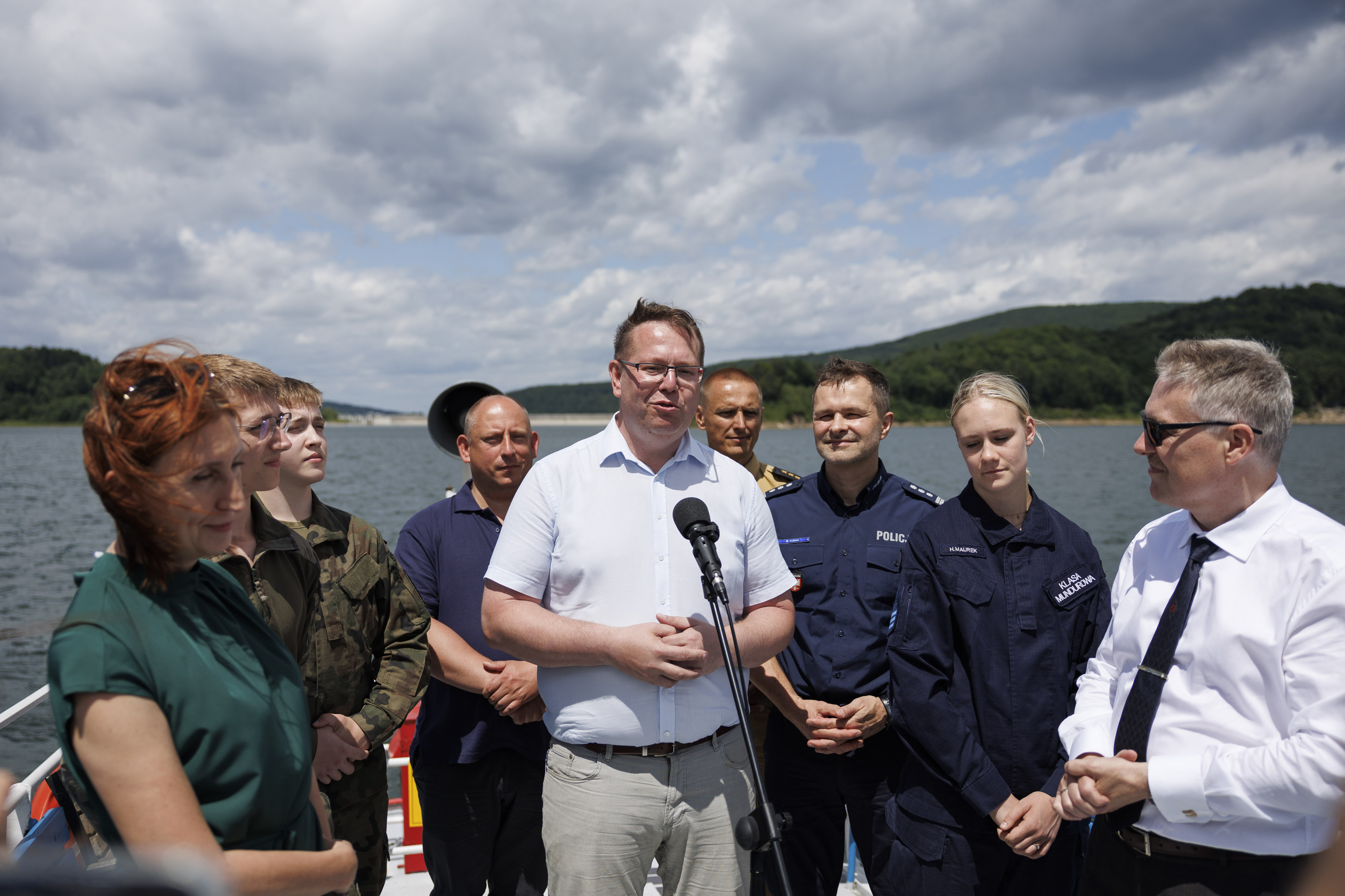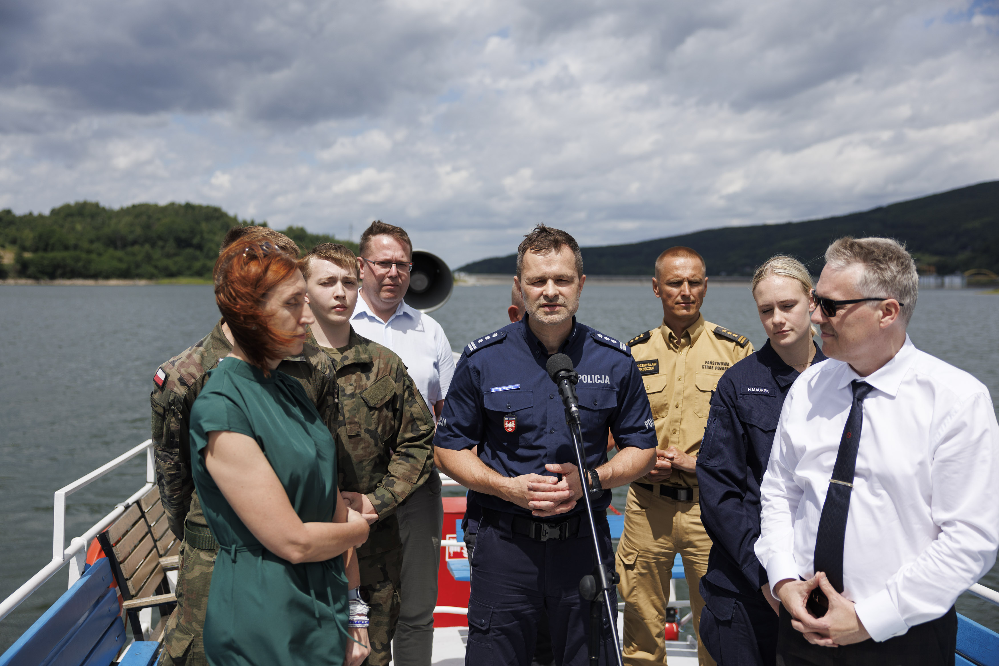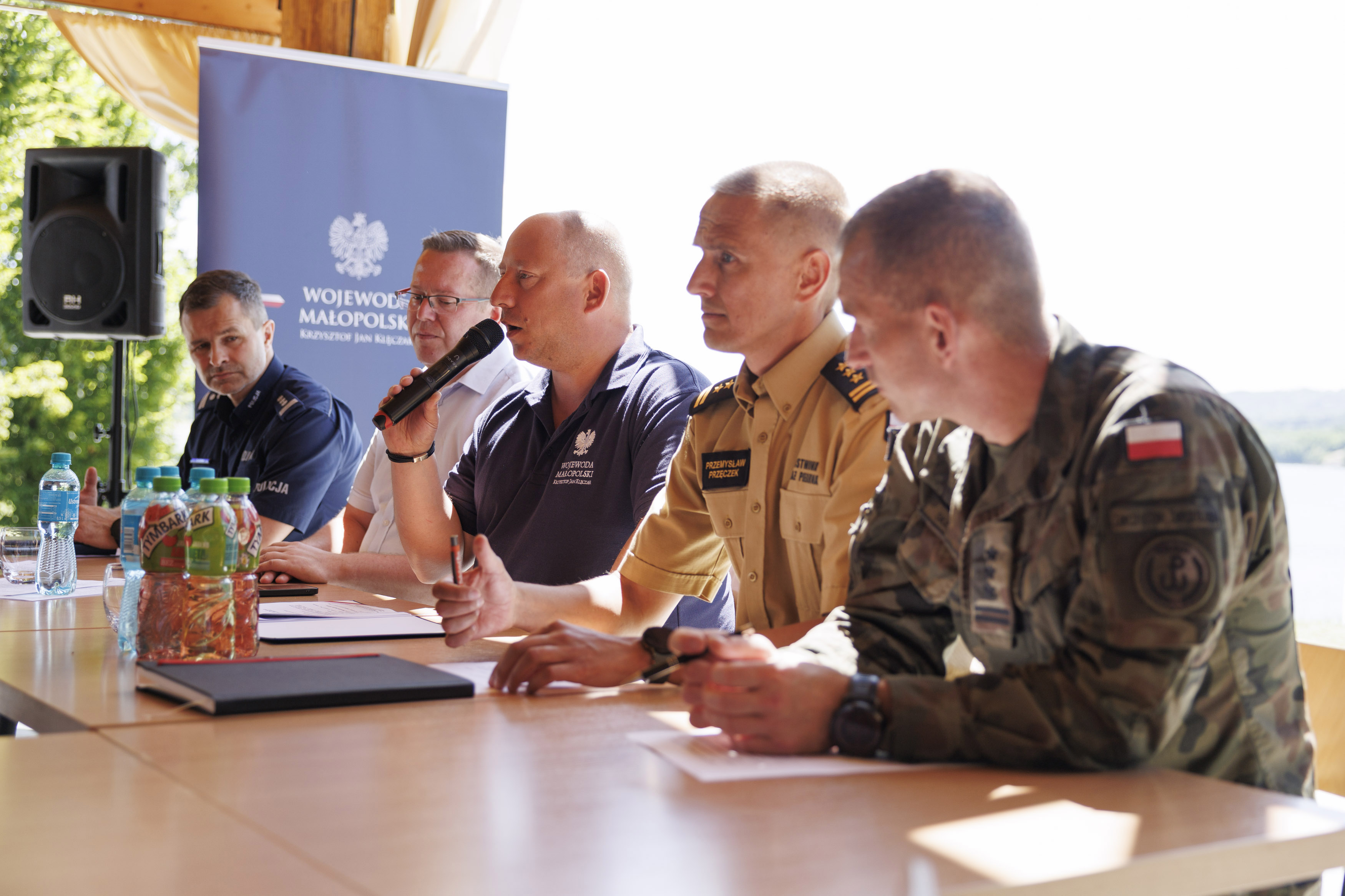 Posiedzenie Wojewódzkiego Zespołu Zarządzania Kryzysowego odbyło się na terenie Przystani Wodnej nad Jeziorem Mucharskim w Świnnej Porębie (gm. Mucharz). Ustalenia omówił wojewoda małopolski Krzysztof Jan Klęczar oraz przedstawiciele służb podczas briefingu prasowego na łodzi, pływającej na co dzień po jeziorze Mucharskim.
