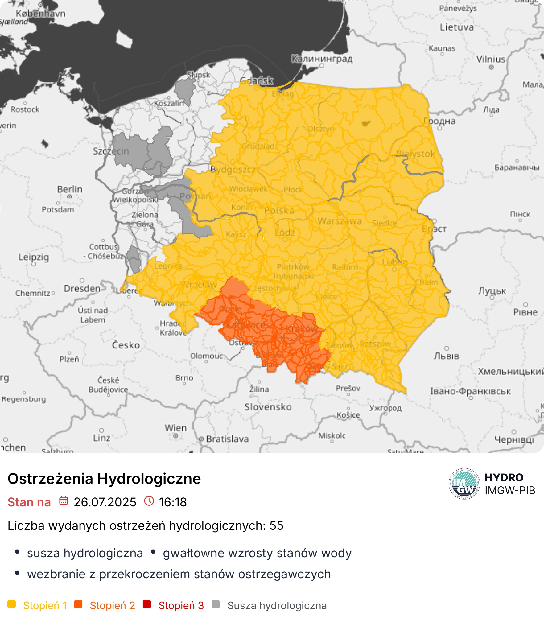 Małopolska została też objęta ostrzeżeniami hydrologicznymi pierwszego i drugiego stopnia - o gwałtownych wzrostach stanów wód i wezbraniach z przekroczeniem stanów ostrzegawczych. Możliwe są podtopienia.