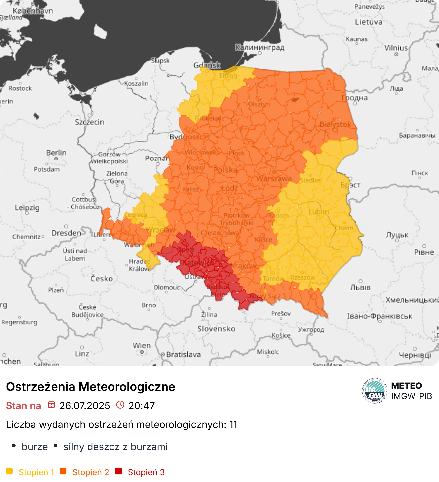 Całe województwo jest objęte ostrzeżeniami meteorologicznymi IMGiW o deszczu z burzami lub burzach, w tym część województwa (powiaty chrzanowski, oświęcimski, wadowicki, suski, nowotarski, tatrzański) ostrzeżeniami najwyższego, trzeciego, stopnia. Wysokość opadu od 90 do 110 mm, lokalnie 120 mm. Porywy wiatru mogą sięgnąć 80 km/h. Możliwy jest też grad.