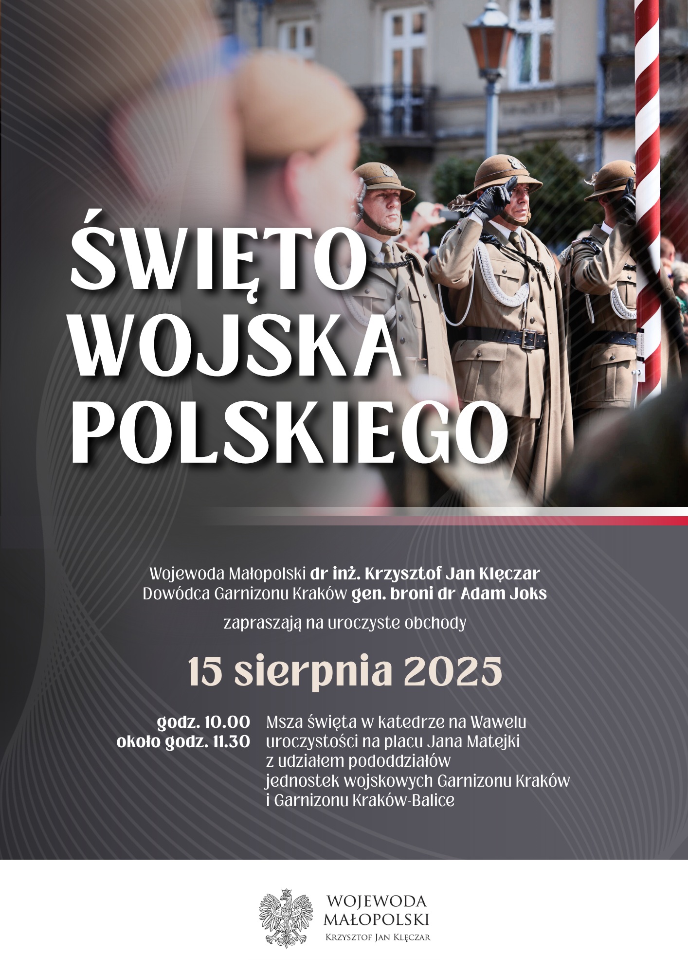 – Zwycięstwo oddziałów Wojska Polskiego nad Armią Czerwoną w 1920 r. było nie tylko sukcesem militarnym, wyrazem męstwa i poświęcenia walczących, ale także spoiwem narodowym. Również dzisiaj mundur żołnierza jest odzwierciedleniem wartości niesionych przez kolejne pokolenia: honoru, całkowitego oddania powierzonym obowiązkom i odwagi. Z wdzięcznością i szacunkiem świętujmy razem z tymi, którzy współcześnie tworzą Siły Zbrojne Rzeczypospolitej Polskiej. To szczególna okazja, by powiedzieć im: „Dziękujemy za Waszą służbę!” – mówi wojewoda małopolski Krzysztof Jan Klęczar.