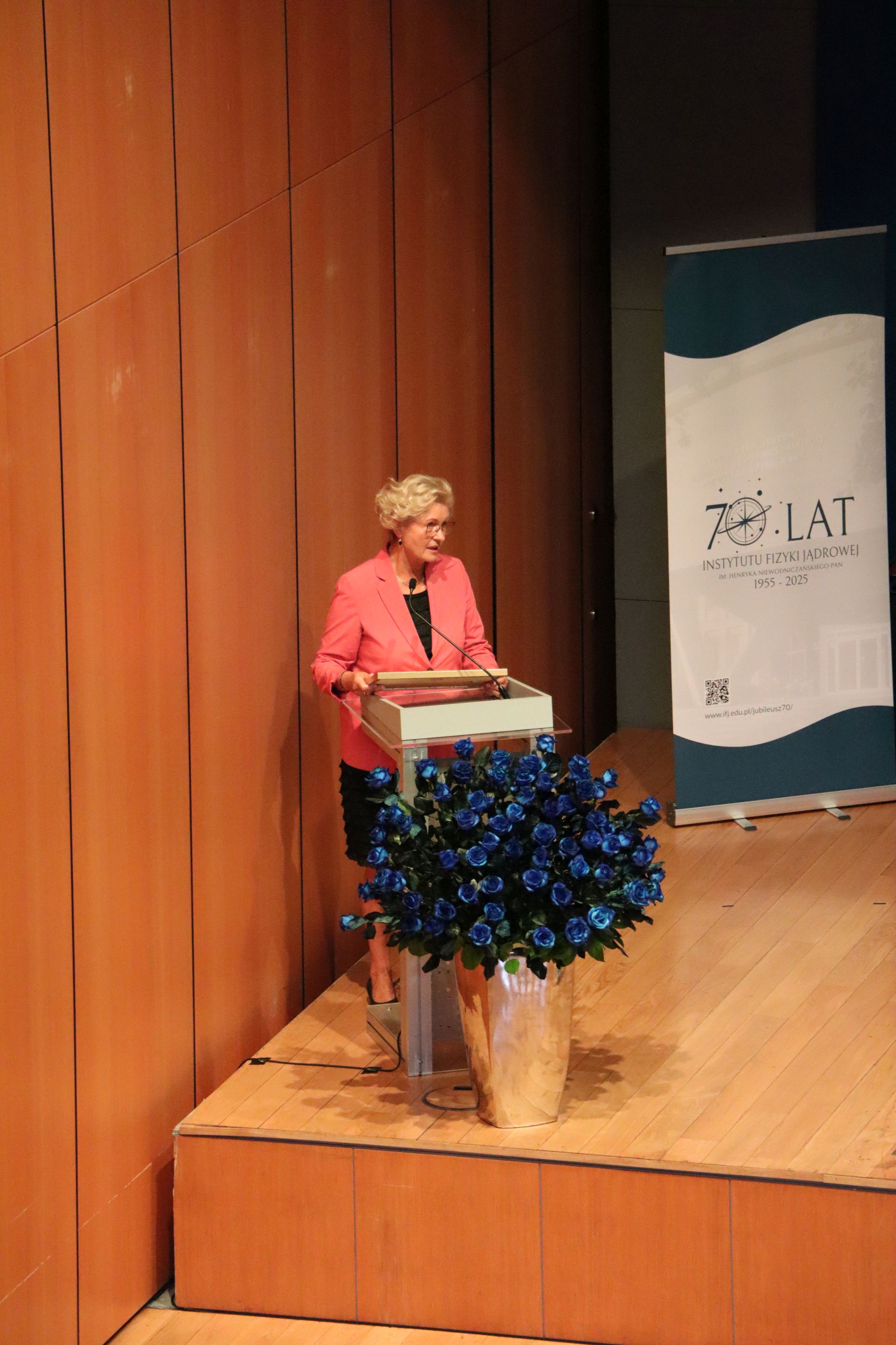 - Siedem dekad działalności, pokolenia naukowców zrzeszonych pod skrzydłami Instytutu Fizyki Jądrowej im. Henryka Niewodniczańskiego PAN to Państwa wkład w dorobek światowej nauki. Dzisiejszy jubileusz jest doskonałą okazją do złożenia gratulacji i podziękowań za lata Państwa pracy badawczej oraz zaangażowanie na rzecz bezpieczeństwa narodowego, w tym wzmocnienia radiologii i jej wykorzystania do leczenia pacjentów. Życzę dalszego rozwoju i wielu sukcesów. Niech kolejne lata przyniosą Państwu satysfakcję oraz wszelką pomyślność – mówi I wicewojewoda małopolska Elżbieta Achinger.