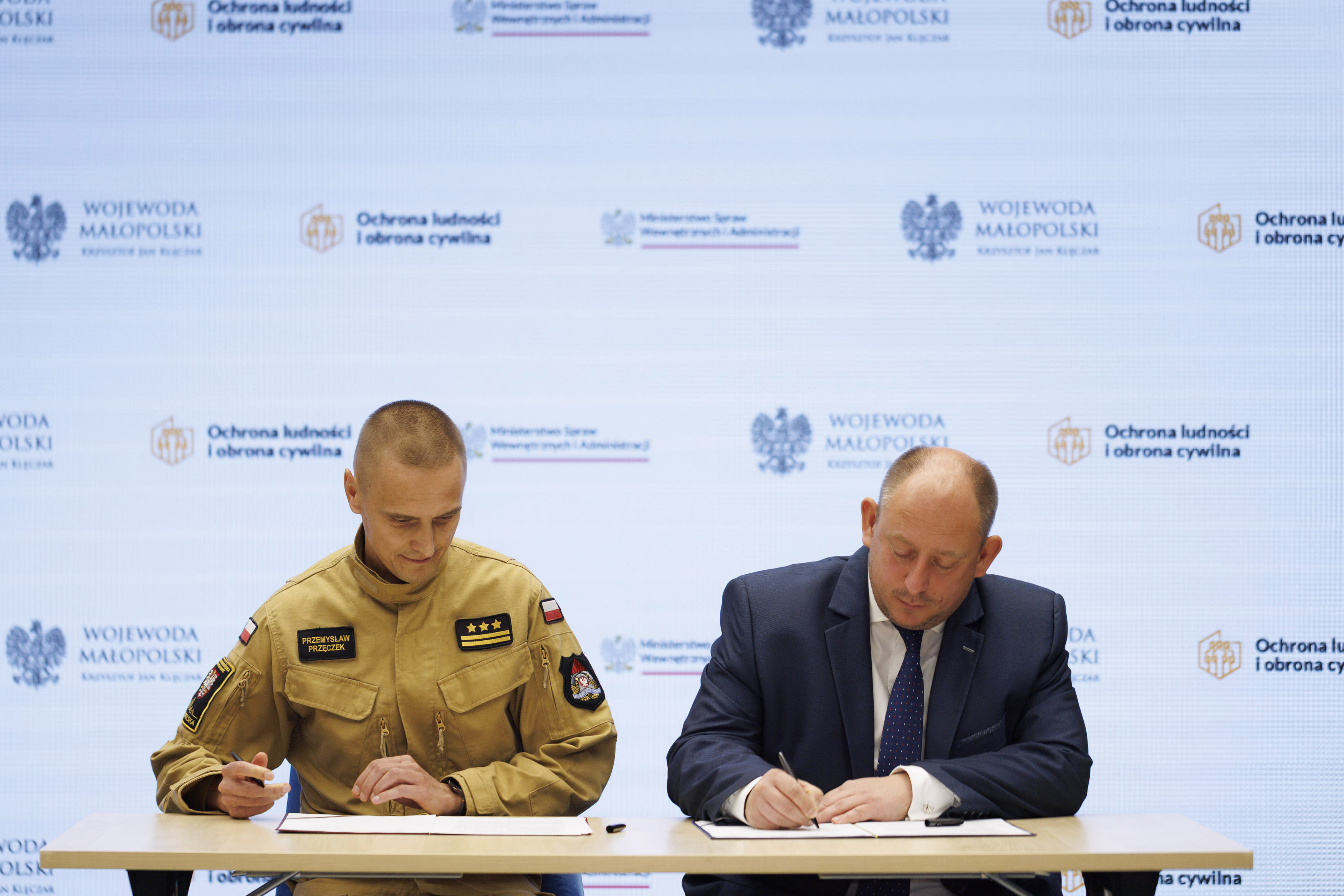 Aby dodatkowo wzmocnić i rozszerzyć w Małopolsce system powiadamiania, ostrzegania i alarmowania ludności o zagrożeniach, wojewoda małopolski Krzysztof Jan Klęczar podpisał dziś w Małopolskim Urzędzie Wojewódzkim w Krakowie porozumienie o współpracy z małopolskim komendantem wojewódzkim Państwowej Straży Pożarnej st. bryg. Przemysławem Przęczkiem.