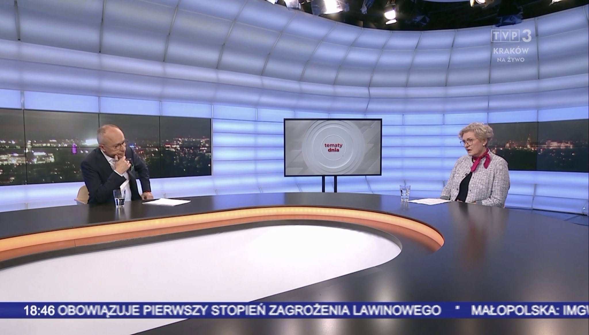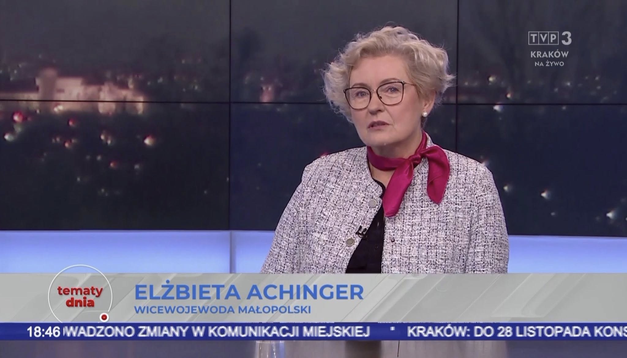 Gościem „Tematów dnia” w TVP3 Kraków była I wicewojewoda małopolska Elżbieta Achinger. Rozmawiano o polityce społecznej i senioralnej w Małopolsce, Złotym Jubileuszu Uniwersytetów Trzeciego Wieku w Polsce oraz o rządowym programie „Senior+”.