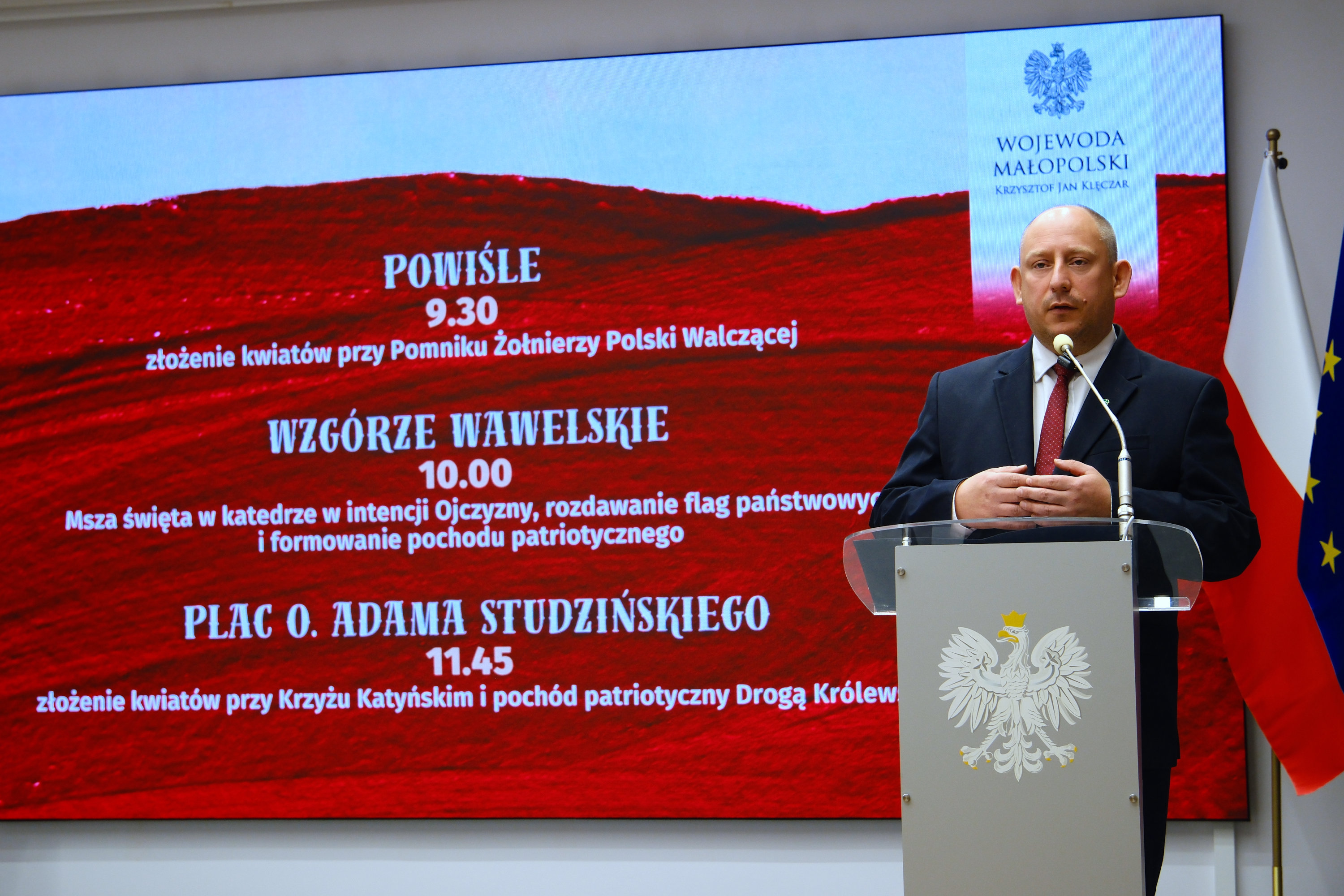 Na zdjęciu wojewoda małopolski Krzysztof Jan Klęczar przemawiający przy ambonie do mikrofonu. W tle na ścianie ekran z wyświetlonym napisem: wojewoda małopolski Krzysztof Jan Klęczar zaprasza na Narodowe Święto Niepodległości.